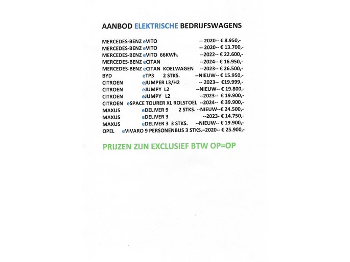 Dit is de scherpe internet meeneemprijs Exclusief BTW Ook bieden wij de mogelijkheid van gespreide betaling in samen werking met de grootste autofinancier van Nederland - ook kunnen wij als service u helpen met uw autoverzekering , Wilt U Zelf bepalen wat u wilt betalen per maand kijk dan op de website van www.autodebruin.nl bij de knop /Financiering . Innovatieve toptechniek en een uitgesproken karakter. De e-Jumpy is een onderscheidende auto met een elektrische aandrijflijn. Stil en stevig optrekken zonder extra uitstoot? De elektromotor zorgt ervoor ! 50 Kwh Batterij ! KOSTEN RIJKLAAR MAKEN INCL AFLEVERINGS BEURT € 699,- Al onze verkopen zijn gebaseerd op business to business (B2B) zonder garantie , Particuliere verkoop is uiteraard mogelijk, vraag naar de mogelijkheden , garantie is mogelijk tegen meerprijs vraag naar de mogelijkheden.