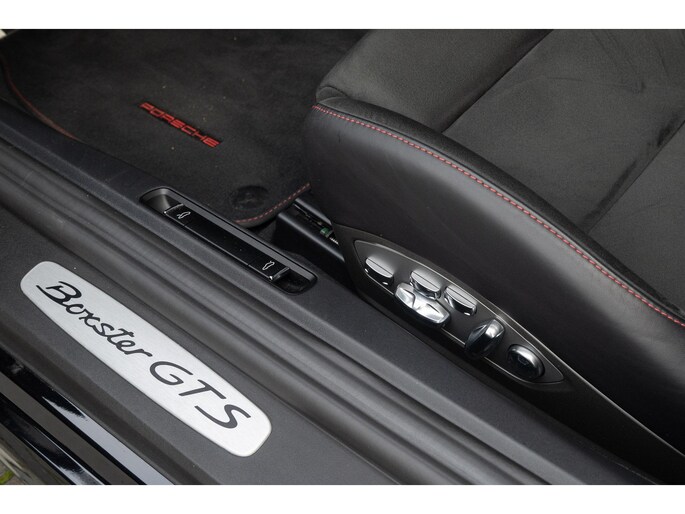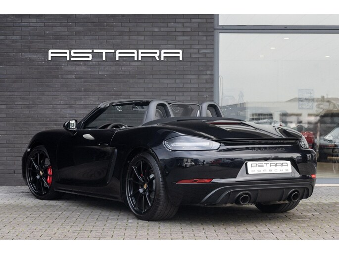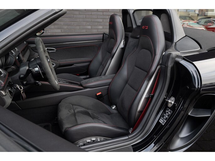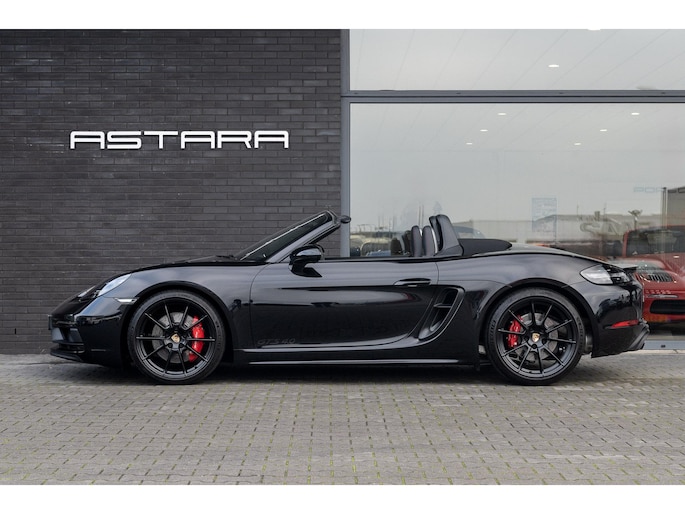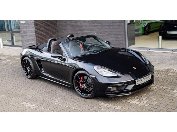 Porsche 718 Boxster GTS 4.0 uit 2023, uitgevoerd in diepzwart metallic, velgen gespoten in zwart zijdeglans en een zwart interieur met GTS karmijnrood pakket.