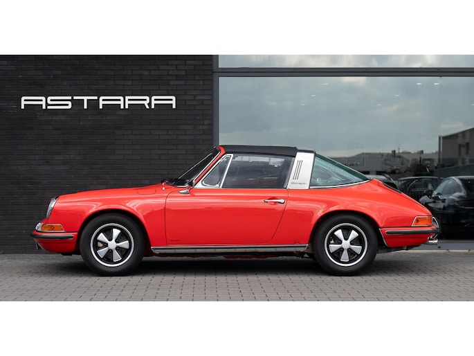 For English: please scroll down Porsche 911E 2.4 MFI targa Ölklappe, in oranje met een zwart interieur.
