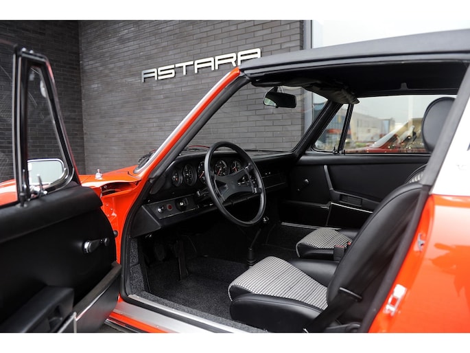 ----------------------------------- Porsche 911E 2.4 MFI targa Ölklappe, in orange with a black interior.