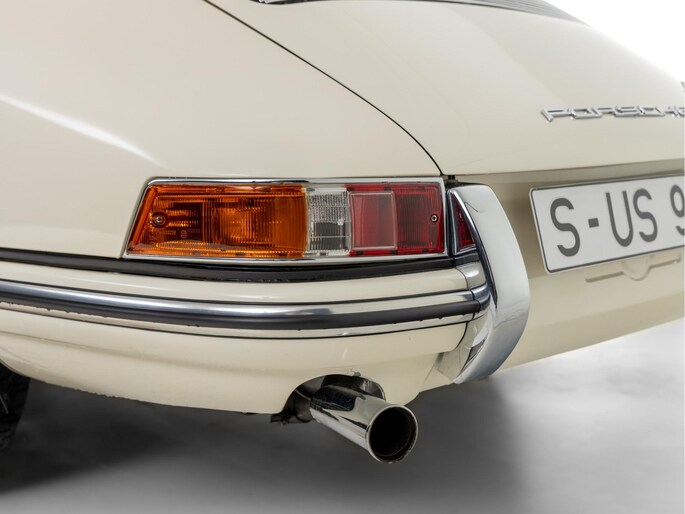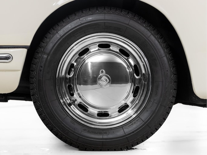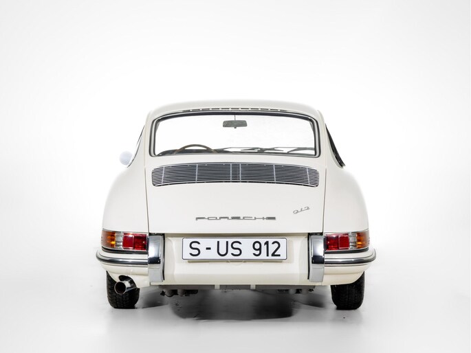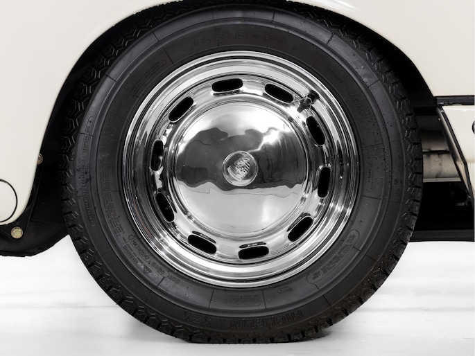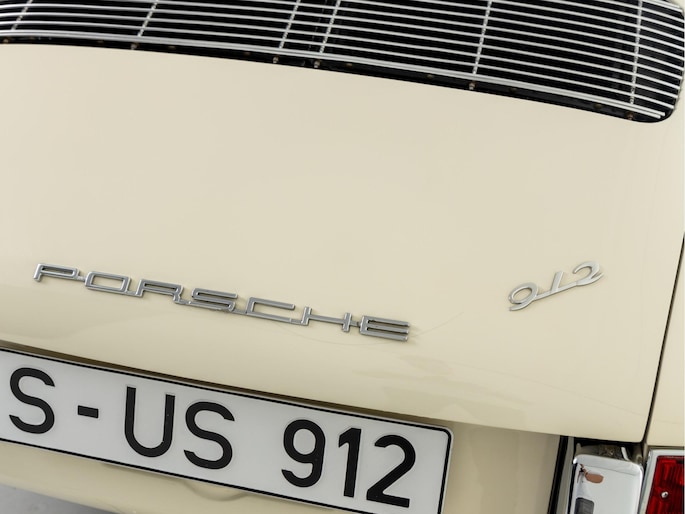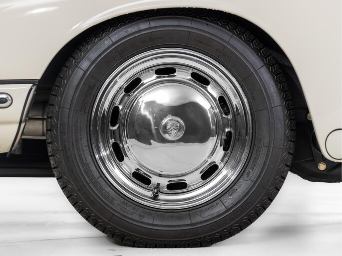 The original matching engine is present complete with Solex 40 PI-4 carburettors. The 901 gearbox is a modified 5-speed from the 911 to a 4-speed version. Further special details include the original 356 BT-6 chassis plate with raised 912 description, aluminium door hinges and window frames as well as 4 rims with date codes of 10-1964. A special detail are the front wings with more "rim and tyre" space, but still with the 4-point front grille attachment. This, combined with the elaborate wheel arches at the rear, indicates pre-production test parts for the later 1968 model year.