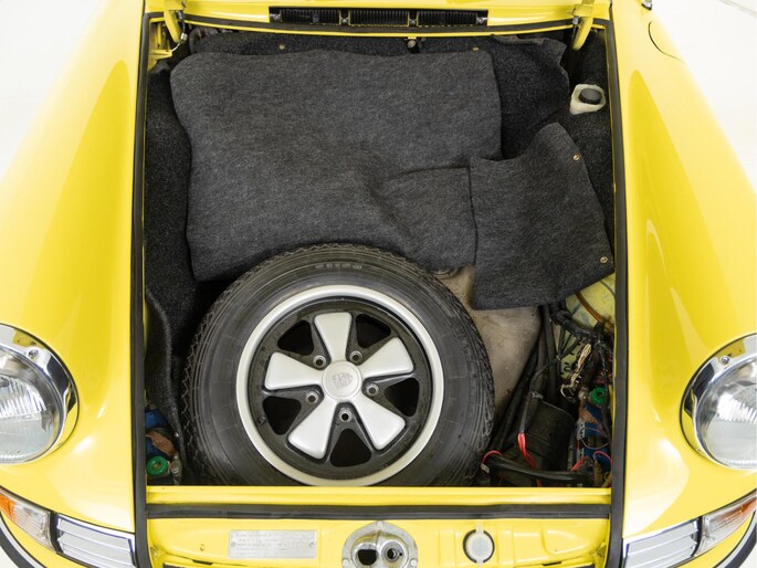 This is also a very early production of model year 1972, chassis number 18 !!!. Produced in August 1971. A nice detail of this is the front bumper made of Fiberglass. Which were reportedly only fitted to the first 20 cars. At the time, this was the newly designed bumper with integrated spoiler lip, exclusive to the S models. This extremely rare front bumper is still present. Furthermore, the engine and gearbox are matching numbers and the Porsche is in very good condition both optically and technically. The bodywork is even completely original and unrestored. Only once has the 911 been completely repainted. In the process, the engine and boot area in the front remained untouched. The paintwork was professionally done.