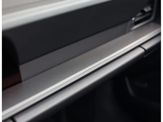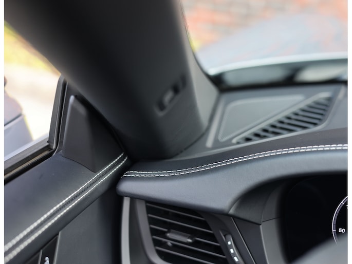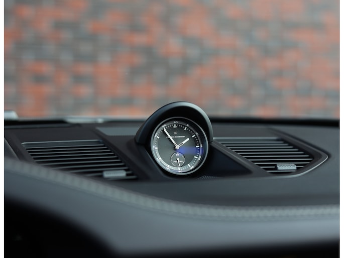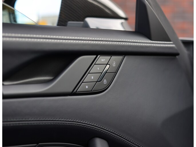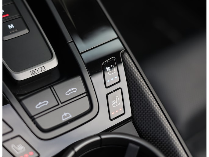 Binnenin gaat het gevoel van perfectie verder. Het interieur is uitgevoerd in zwart leder met Race-Tex accenten en carbon details. De stoelen zijn niet alleen prachtig om te zien, maar ook technisch indrukwekkend. Ze bieden achttienvoudige verstelling, ventilatie en verwarming, met geheugenfunctie. Elk detail ademt kwaliteit. Van de verlichte instaplijsten en gekleurde veiligheidsgordels tot het verwarmde GT-sportstuur en het verfijnde lichtdesign in het interieur.