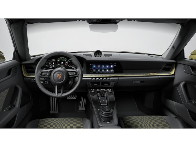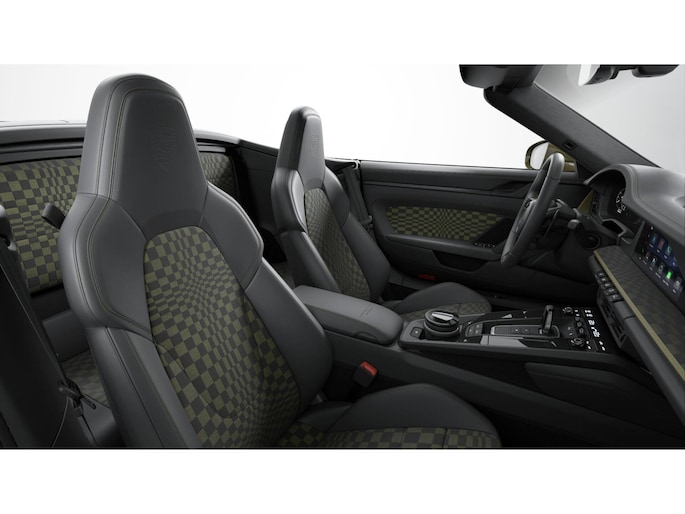 Opvallend is de unieke kleur “Olive Neo”, het klassieke Pasha-interieurpatroon en het gebruik van historische Porsche-logo’s.