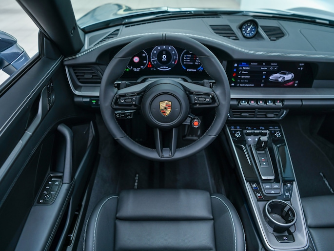 De vernieuwde 911 Carrera S Cabriolet generatie 992.2 is technologisch geavanceerder dan ooit. Het digitale instrumentencluster is volledig naar wens in te stellen, met directe toegang tot navigatie, rijinformatie en rijmodi. Het interieur ademt sportieve luxe, met een mix van hoogwaardig leer, aluminium accenten en moderne displays, een omgeving die uitnodigt om de focus volledig op de weg en het rijden te richten.
