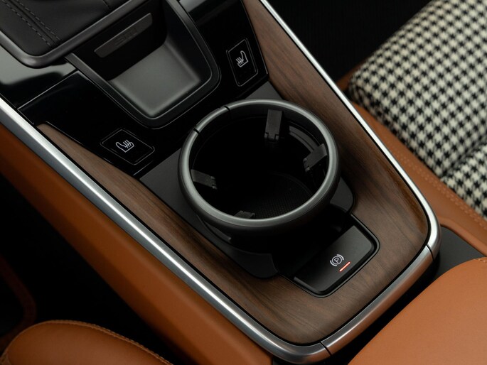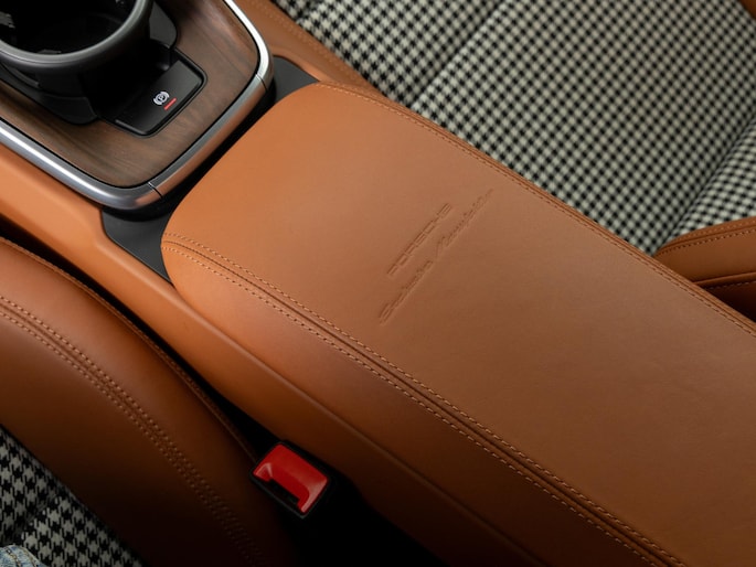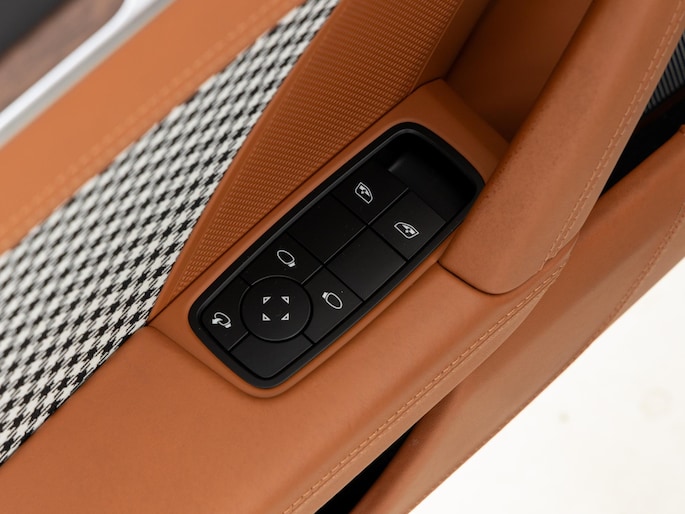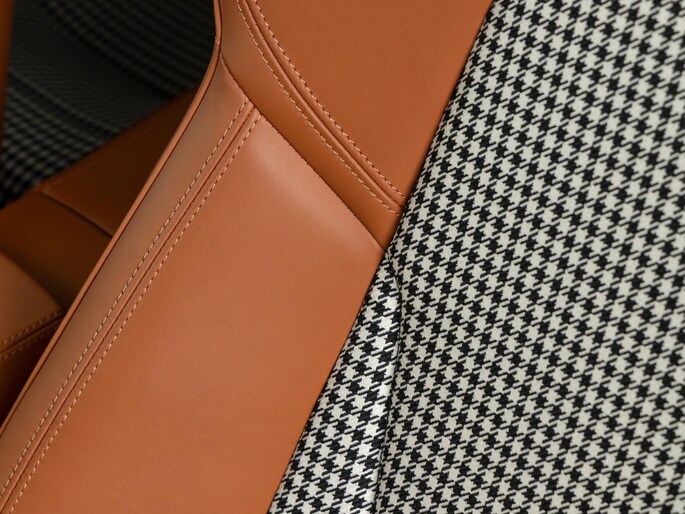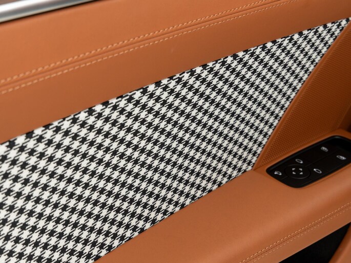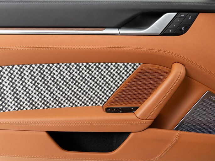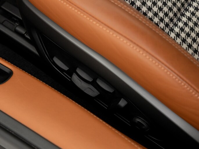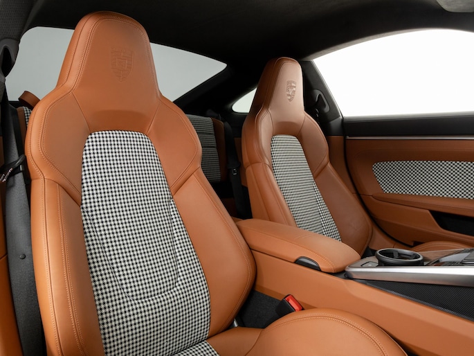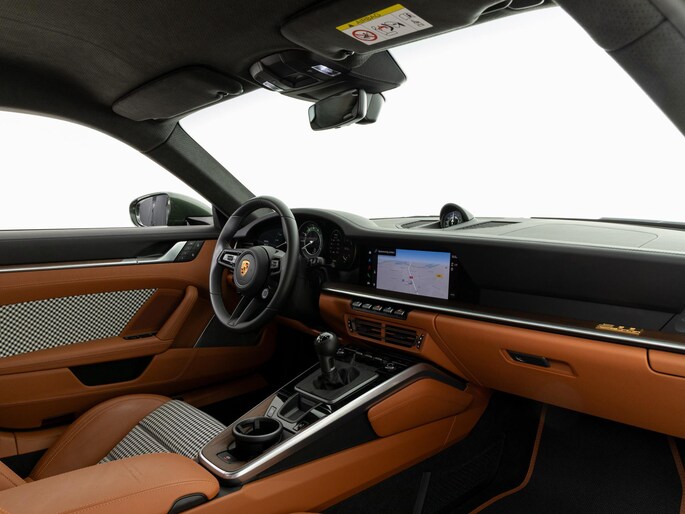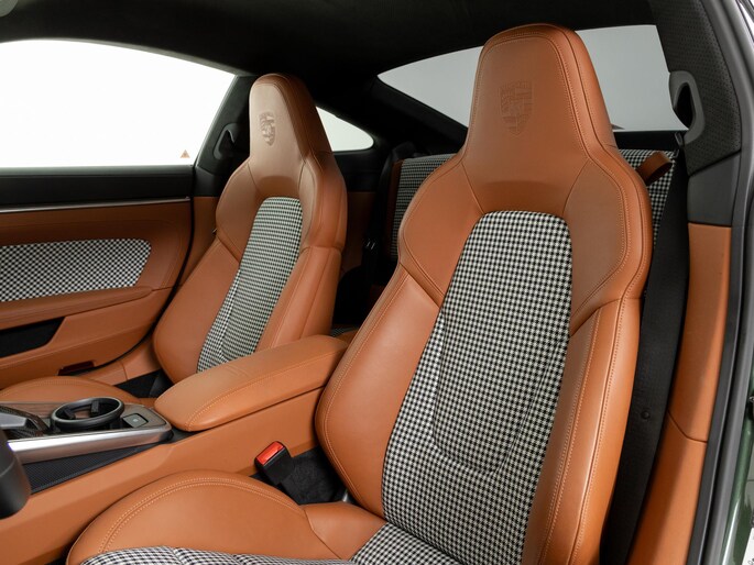Binnenin vinden we het iconische pepita-patroon op de stoelen en deurpanelen, gecombineerd met tweekleurig semi-aniline leder in zwart en cognac. Het interieur ademt klassieke Porsche-stijl, met moderne digitale instrumenten en een hoogwaardige afwerking.