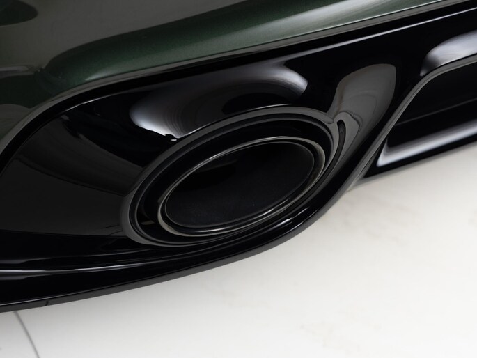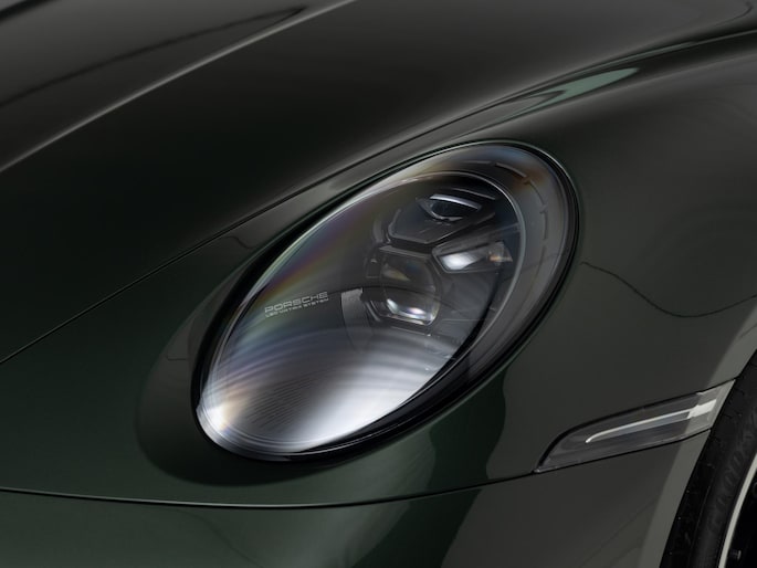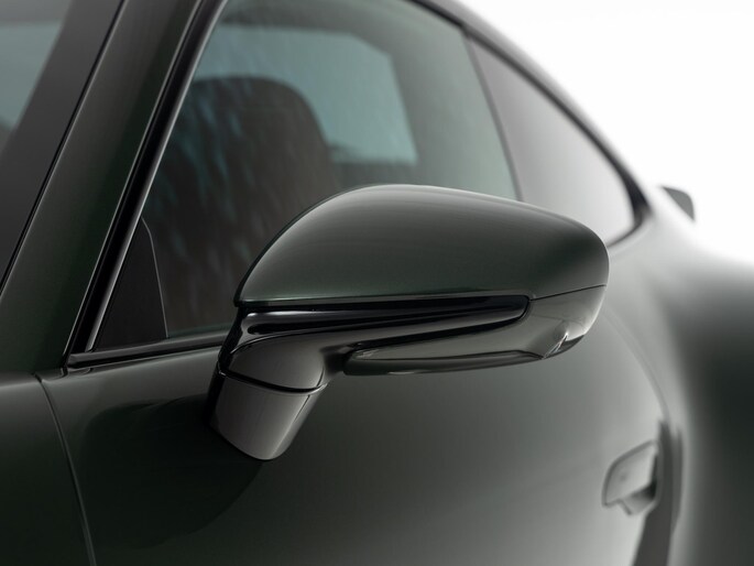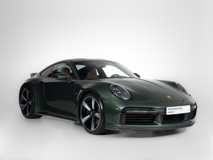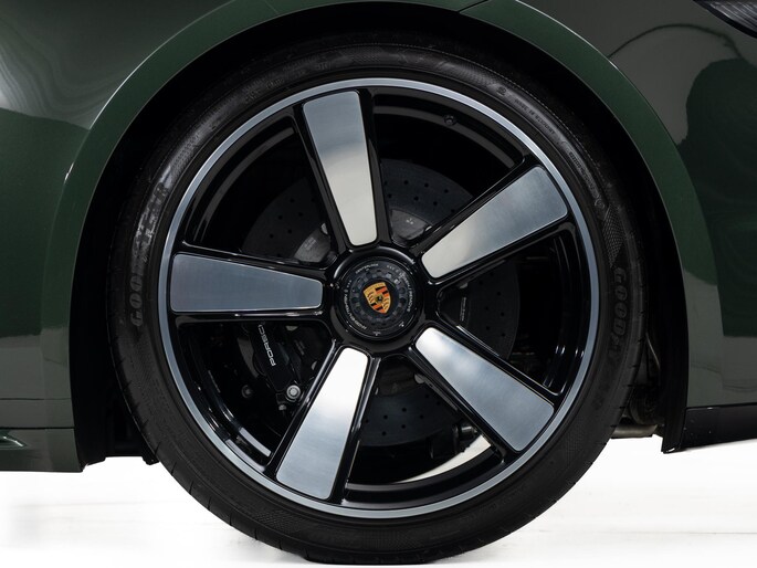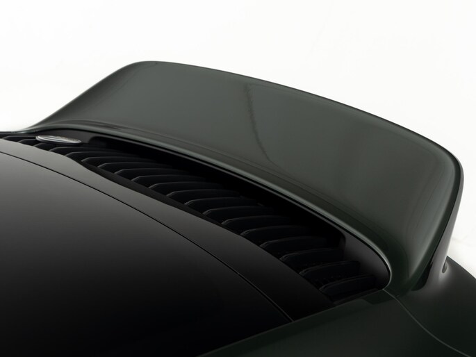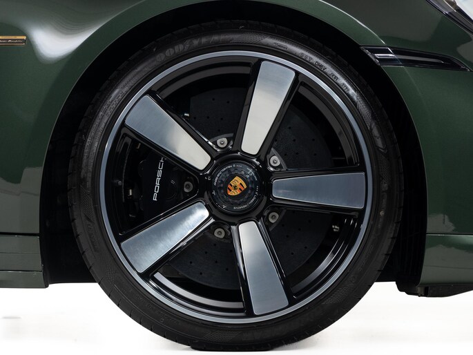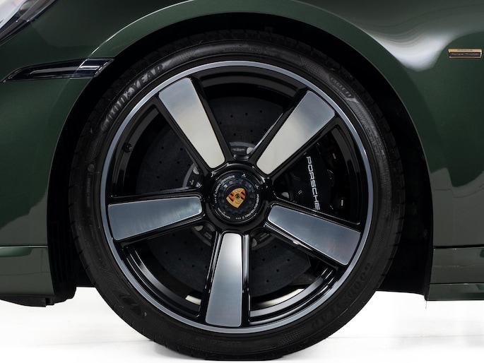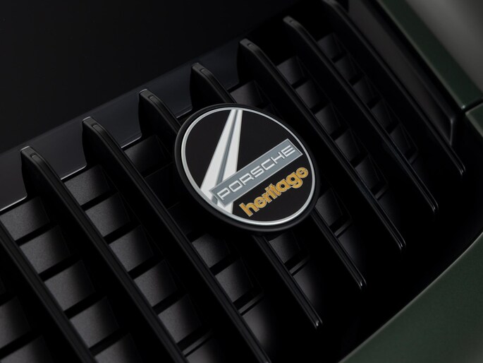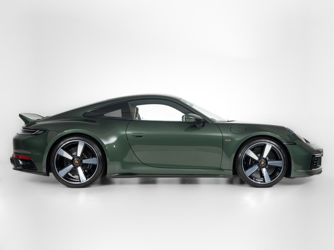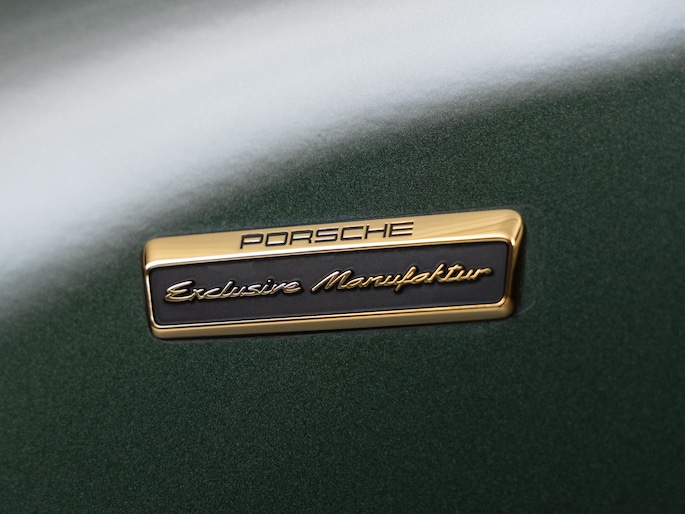 Het exterieur combineert moderne techniek met retro-elementen: een vaste 'ducktail'-spoiler, brede Turbo-carrosserie zonder luchtinlaten in de achterste zijpanelen, en een dubbelgewelfd dak. De standaardkleur is Sportgrijs metallic, geïnspireerd op de originele Porsche 356, maar dit exemplaar is uitgevoerd in de kleur naar keuze: Oak Green Metallic.
