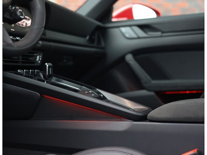 In het interieur vinden we de échte GTS-uitvoering terug: Zwart leder en Alcantara met GTS-logo’s in de hoofdsteunen gestikt. Om toch wat meer alledaagse luxe te bieden is deze Porsche uitgerust met een glazen schuif-/kanteldak, iets wat niet vaak voorkomt! De 18-voudig verstelbare adaptieve sportstoelen zijn voorzien van verwarming zodat u altijd goed zit, ongeacht het seizoen.