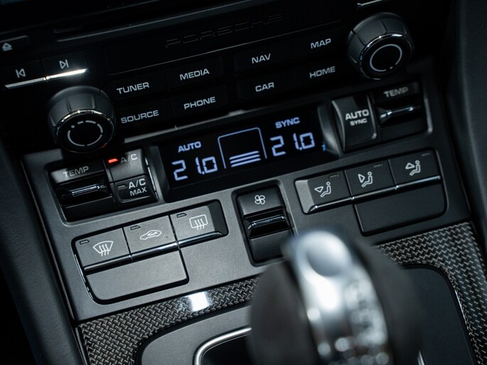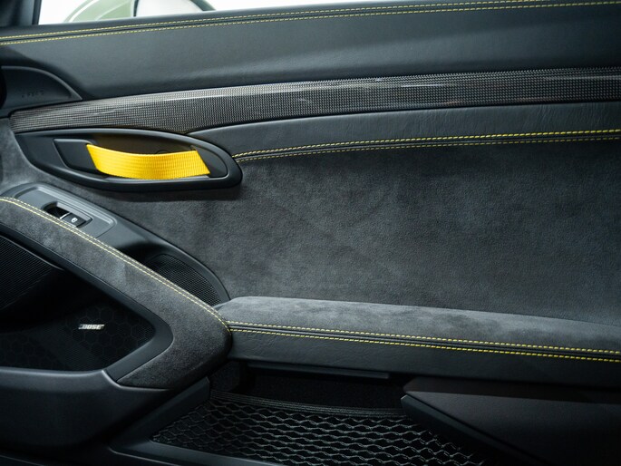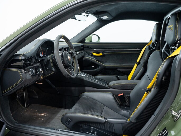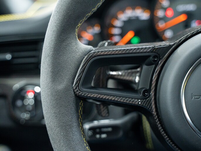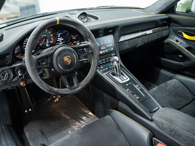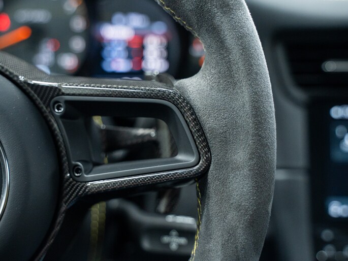 De 991.2 GT3 RS is voorzien van ultralichte kuipstoelen in carbon, clubsport-pakket met rolkooi en 6-puntsgordels (optioneel), en een interieur dat gericht is op één ding: rijden. Alcantara, carbon fiber en het ontbreken van overbodige luxe versterken dat doelgerichte karakter.