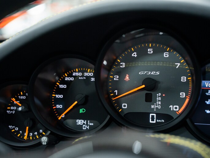 Onder de kap ligt een meesterwerk: een 4.0-liter zescilinder boxermotor, atmosferisch, hoogtoerig en ongefilterd. Met een piekvermogen van 520 pk en een maximumtoerental van maar liefst 9.000 toeren per minuut, is dit blok een van de meest emotionele motoren ooit gebouwd. De 991.2 GT3 RS accelereert van 0 naar 100 km/u in slechts 3,2 seconden, geholpen door de razendsnel schakelende PDK-transmissie en het lage gewicht dankzij intensieve toepassing van carbon, aluminium en magnesium.