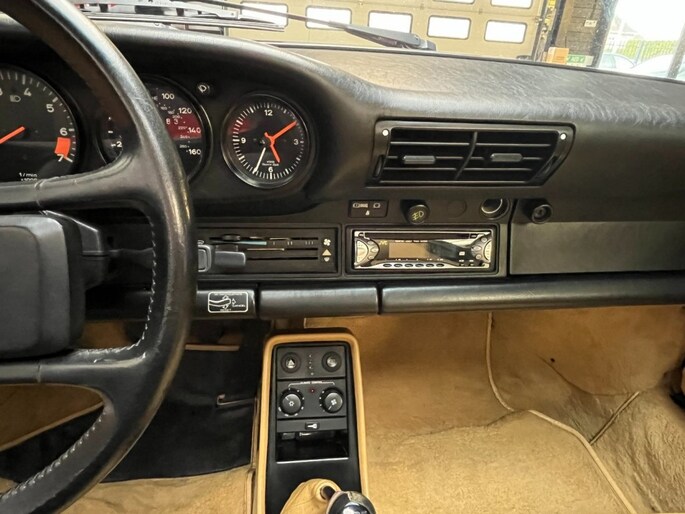 Het interieur is origineel en netjes bewaard gebleven. De tan lederen stoelen verkeren in mooie staat en het dashboard is vrij van scheuren — geen vanzelfsprekendheid bij een 911 van deze generatie.