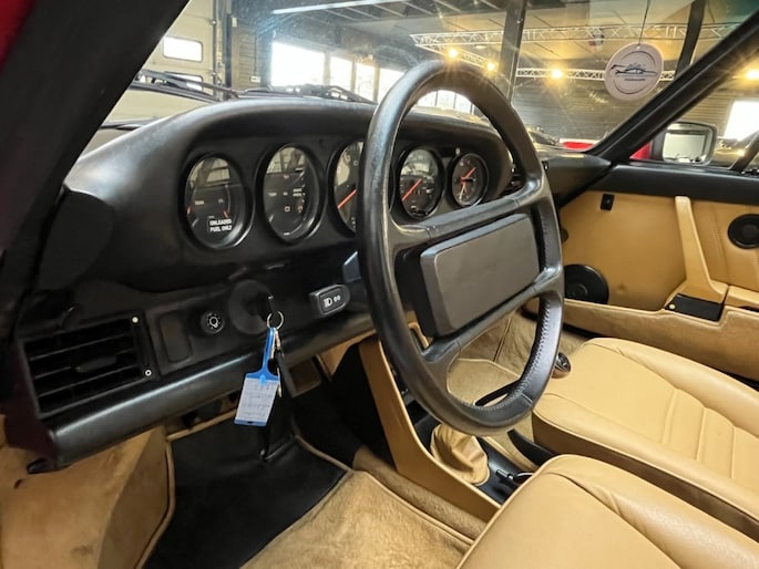 Uitgevoerd in Guards Red met een origineel tan lederen interieur is dit precies de klassieke configuratie die bij een G-serie 911 hoort. De kleurstelling is tijdloos en past perfect bij de lijnen van dit model.