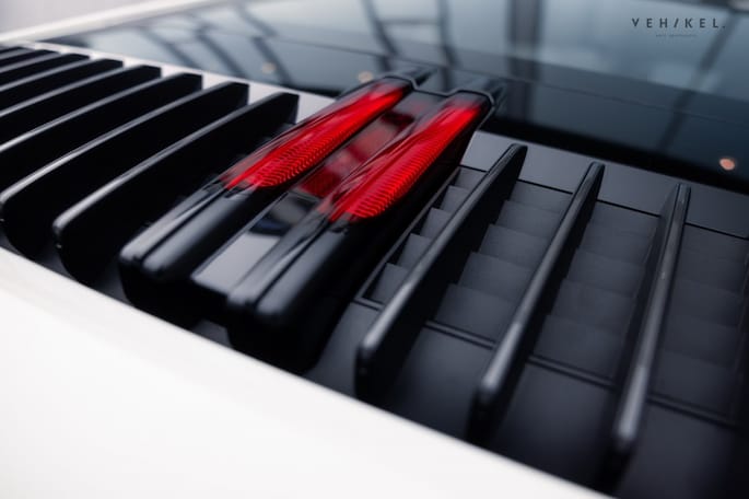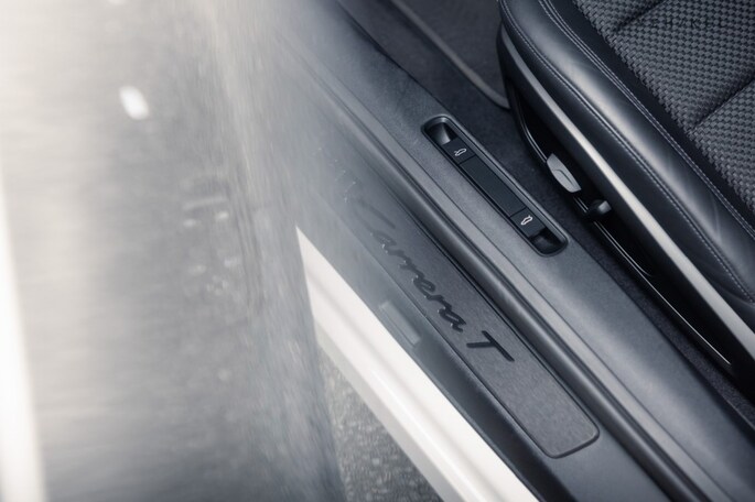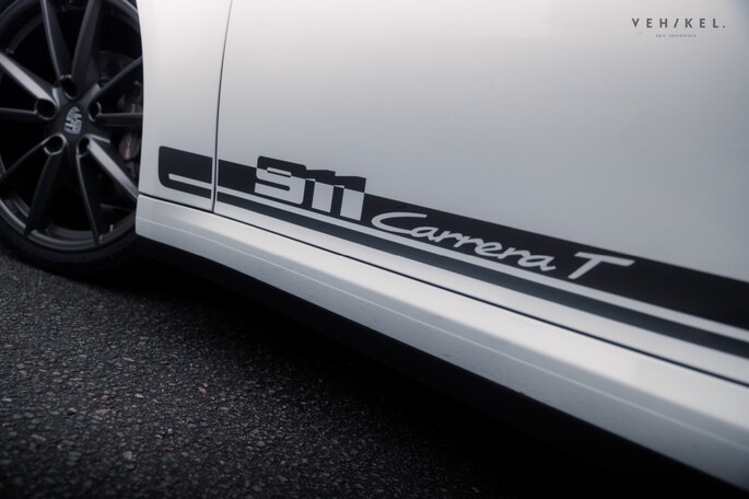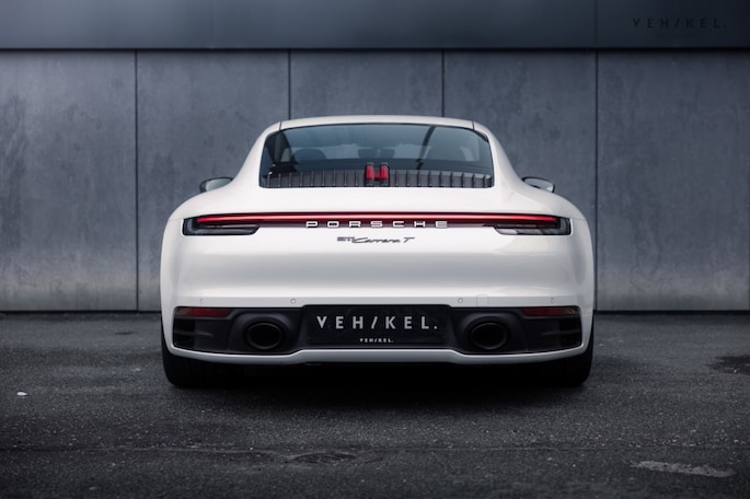 De eindstukken van het sportuitlaatsysteem zijn op voorhand al zwartgeblakerd, dan hoeft uw rechtervoet dat niet meer te doen. Bovendien past dit perfect bij het strak witte koetswerk en de antracietkleurige hoogglans wielen. Privacy glass met daaromheen zwarte sierlijsten, meegespoten tevens antracietkleurige lamellen op de motorkap plus het Porsche-911 Carrera T opschrift achterop voeren de mysterieuze tint tot in detail door op de egaal witte uitdossing van deze op en top sportauto.