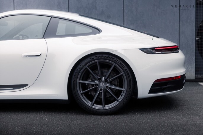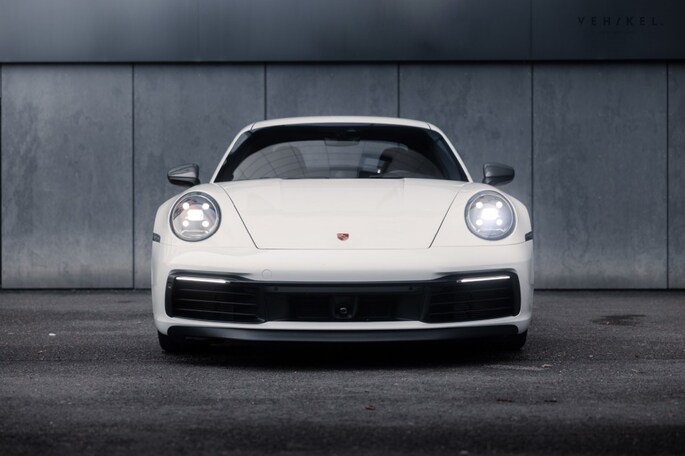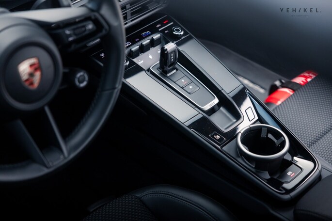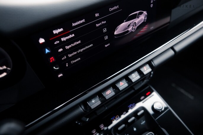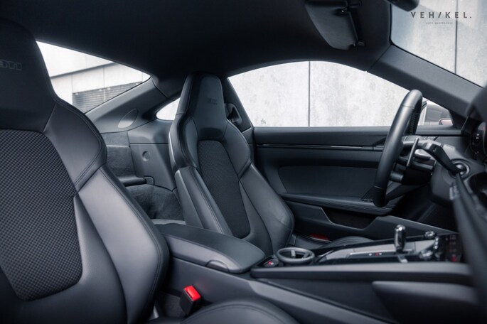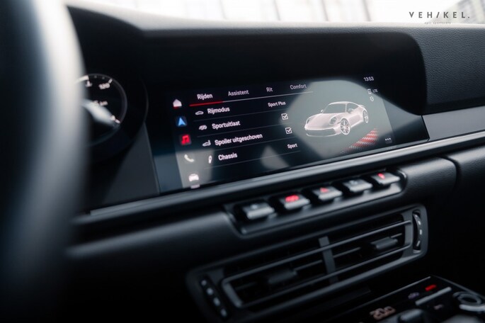 De 911 Carrera T is voorzien van een PDK automatische versnellingsbak - de meest logische keuze voor op landweggetjes en of het circuit - sportonderstel (PASM), sportuitlaat en minder geluidsisolatie. Binnenin zet de passie voor design en techniek zich in stijl voort met onder andere 4-way Sports Seats Plus, verwarmbaar en bekleed met zwart leder in combinatie met Sport-Tex. De analoge toerenteller plus het klokje uit het Sport Chrono pakket zijn lekker karakteristiek tussen alle digitale systemen. Mag het allemaal even ‘relaxt’, dan is er cruise control aan boord met afstandsregeling. Dankzij de mat zwarte dorpellijsten, het sport GT-sportstuurwiel en de elektrisch verstelbare, verwarmde ‘sportstoelen plus’ voelt u zich meteen thuis aan boord van de Porsche 992. Het 911 logo in de hoofdsteunen en Carrera T-opschrift incl. originele bestickering op de flanken zorgen voor exact de juiste sfeer.