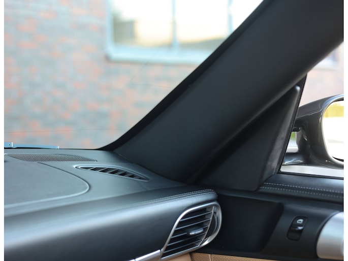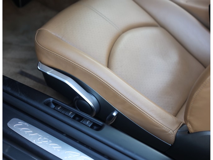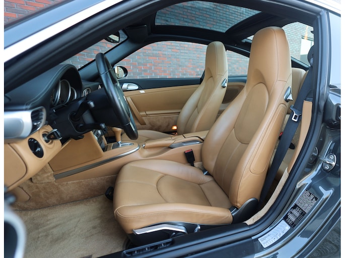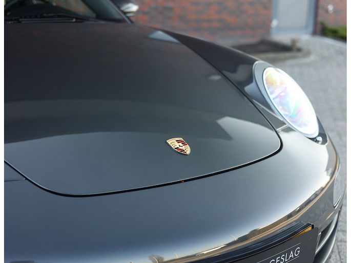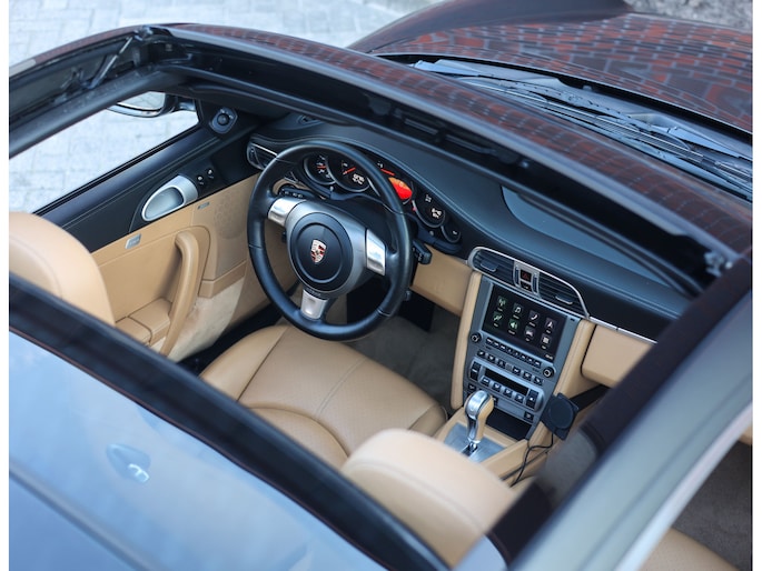 Uitgevoerd in Schiefer Grijs metallic oogt deze Targa zeer stijlvol, met een mooie diepte in het lakwerk afhankelijk van het licht. De brede Carrera Sport velgen geven hem een krachtige stance, terwijl details als bi-xenon koplampen en de afwezigheid van getint glas het geheel verfijnen. Het glazen dak vormt het visuele hoogtepunt en geeft de auto een uniek karakter.