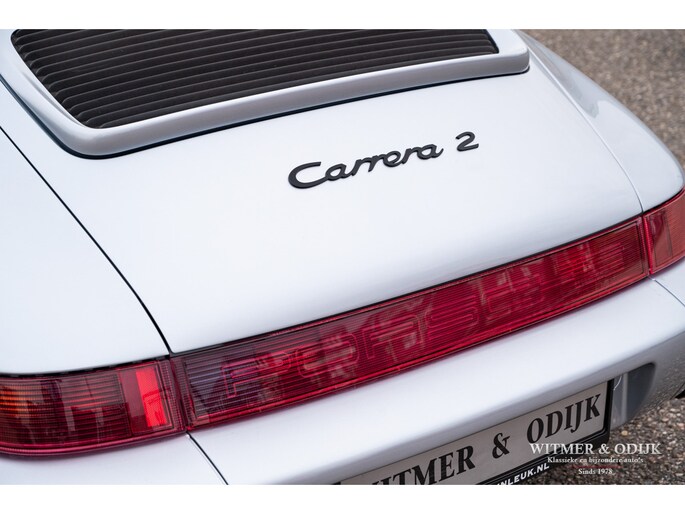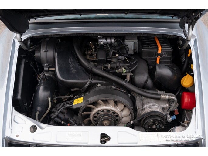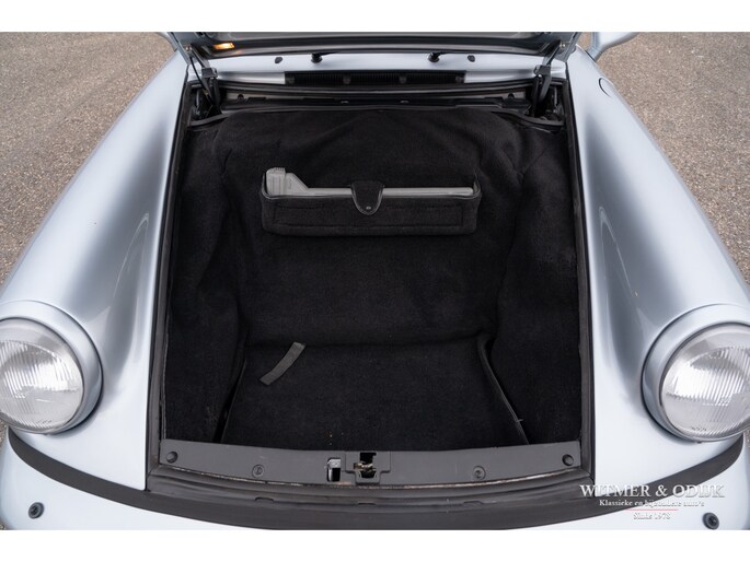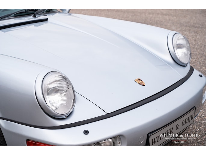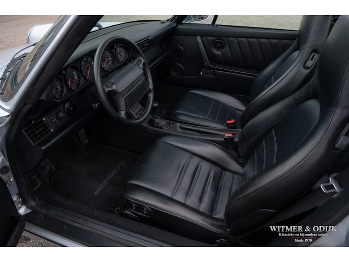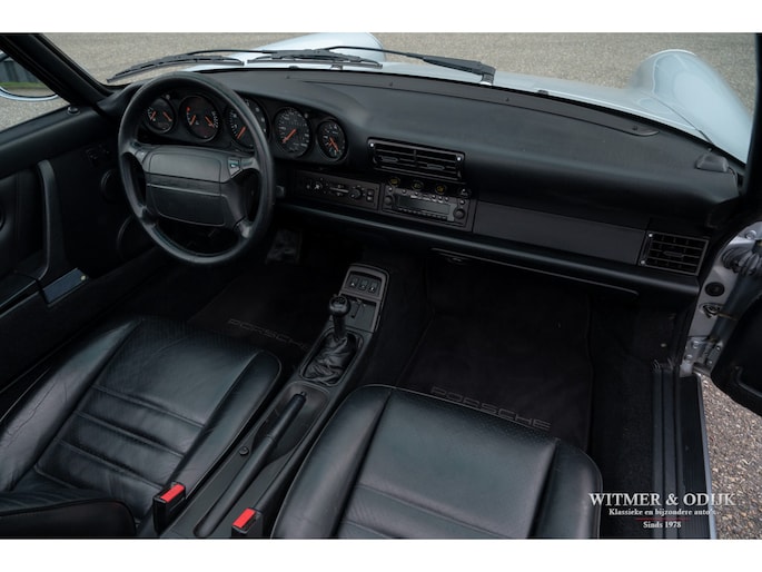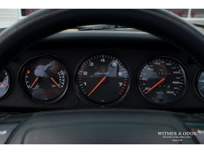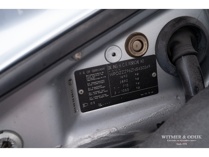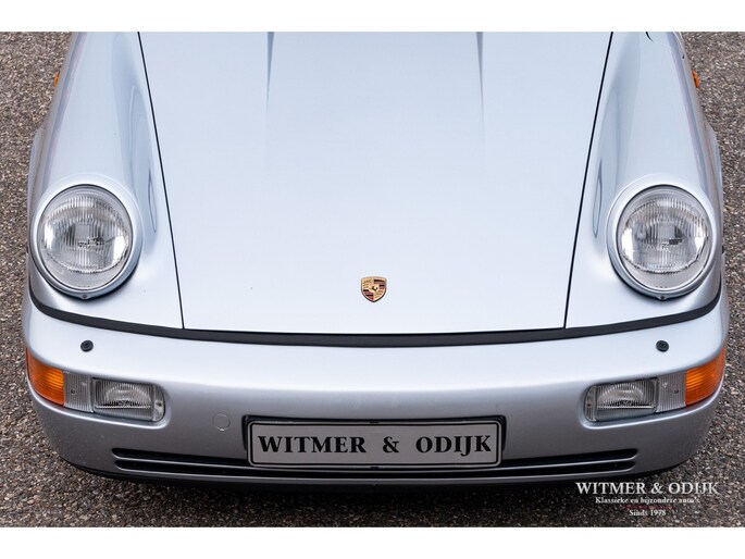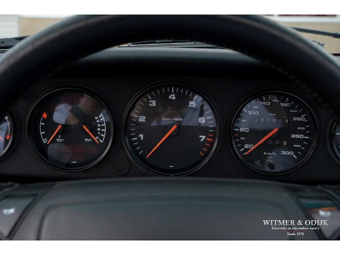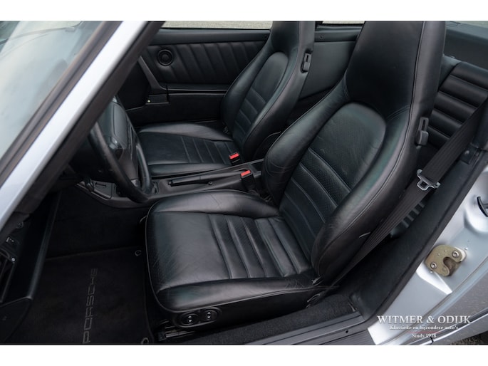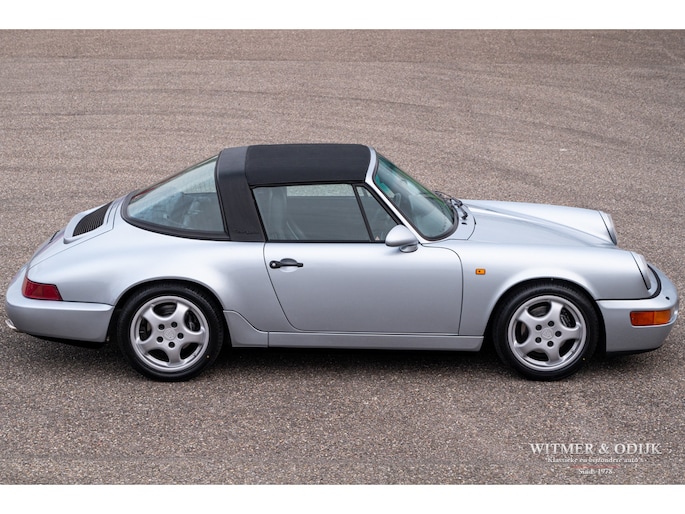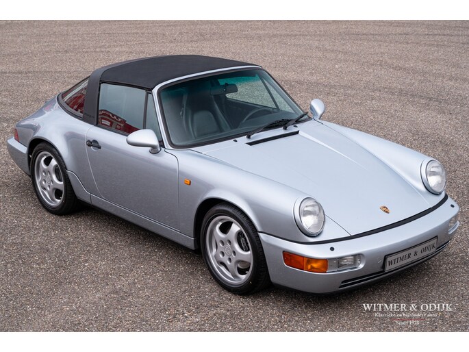 aantallen maakt dat de 964 Targa een zeer gezochte liefhebbers auto. Ook gezien de 'Made in Germany' bouwkwaliteit zeer terecht, goed functionerende 964's met kilometerstanden van tien keer de wereld rond zijn geen uitzondering. Mits goed onderhouden natuurlijk. Dit oorspronkelijk in België geleverde exemplaar kwam al in 2006 naar Nederland. Geimporteerd door Porsche in Leusden, van 1992 tot zeer recent perfect onderhouden door Porsche dealers en specialisten. Bij de auto is een lijvig dossier met facturen die weergeven dat het hier een bovengemiddeld verzorgd exemplaar betreft. Recent nog werden bijvoorbeeld nieuwe Bilstein schokdempers geplaatst, banden rondom vervangen en de uitlaat compleet vernieuwd. In 2025 werd om cosmetische redenen de (schadevrije) carrosserie gerestaureerd en het Targadak nieuw bekleed. Zo is deze Targa ook optisch in topconditie. Alles wat onderhoud technisch aan de beurt kan komen is de afgelopen jaren al eens aangepakt door de, bij ons bekende, laatste eigenaar. Van de remmen tot de gasdempers van de kofferklep, van de draagarmbussen tot de isolatie in de motorruimte, kosten noch moeite werden gespaard om de auto in topconditie te houden. Vanzelfsprekend rijdt ze nu ook zo. Optioneel voorzien van climat control, elektrische stoelhoogte verstelling, airbag's, Becker Traffic Pro radio/cd met afneembaar front, zwart leer, elektrische ramen, etc. Alle originele boekjes met afgestempelde onderhoudsbeurten, taxatierapporten en facturen zijn aanwezig. Wordt afgeleverd inclusief nieuwe APK, garantie en onderhoudsbeurt.