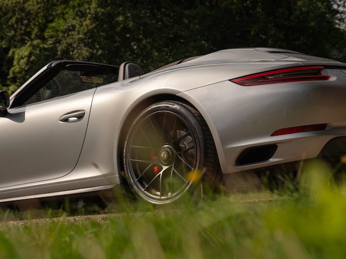 De faceliftversie van de Porsche 991 zorgt onderhuids voor het grootste onderscheid, maar onderging ook optisch een aantal veranderingen. Zo werden de afzonderlijk stads- en knipperlichten in de voorbumper minimalistischer vormgegeven en standaard voorzien van LED-technologie. Aan de achterzijde kregen de LED-units een subtiel andere vorm met kleine verspringing. Het feit dat het hier een GT Zilver metallic GTS betreft mét SportDesign exterieurpakket, maakt dat de Cabriolet ultra onderscheidend is. Anders gestylede bumpers met meer luchtsleuven c.q. -geleiders, alsmede aerodynamisch gevormde SportDesign spiegels zorgen voor de finishing touch. Toch is dat niet het meest opvallende aan deze 991-2 Cabrio: de heuse Turbo S designwielen mét Centerlock zijn 20 inch groot en volledig zwart gespoten. Des te sterker is het contrast met de vuurrode remklauwen! Ook zwart zijn de eindstukken van de dubbele sportuitlaat. Als we u nou zeggen dat onze Elfer klinkt zoals hij eruitziet…?