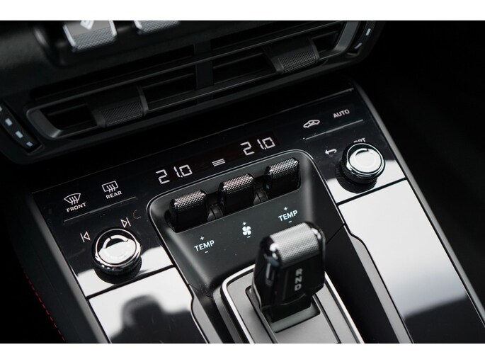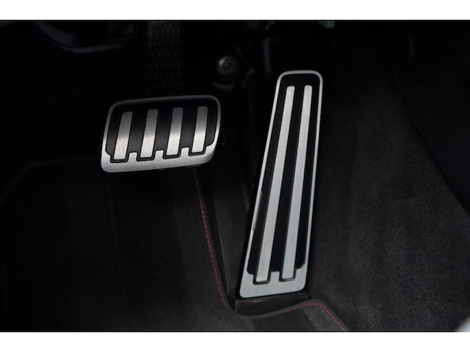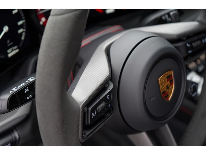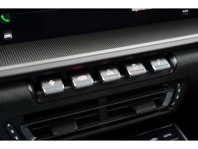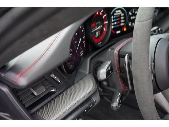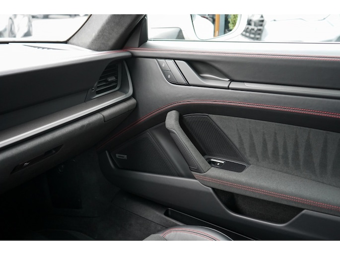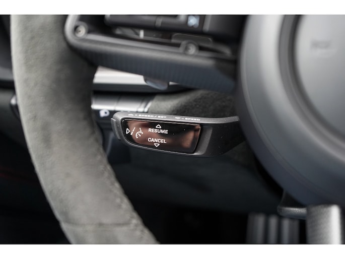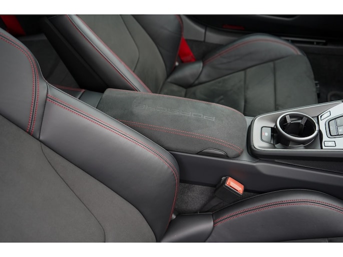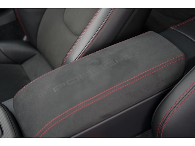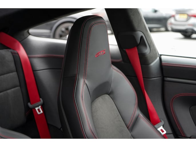 Binnenin bevindt u zich in een cockpit die volledig is gehuld in het GTS Interieurpakket. Dit betekent een overvloed aan Race-Tex (Alcantara) en leder, tot aan de hemelbekleding en de stuurkolom (onderdeel van het uitgebreide lederpakket) aan toe.