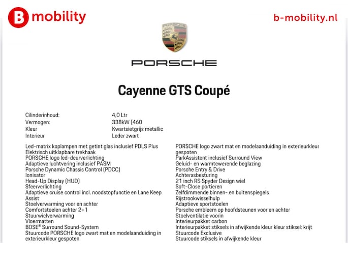 4.0 GTS 460PK 8-Cilinder Orig. NL Trekhaak Panoramadak | Dynamic Chassis Control | Adaptive Cruise Control | Head-Up Display | Bose Sound System | LED-Matrix Koplampen | Adaptieve Sportstoelen | Surround View | Soft-Close