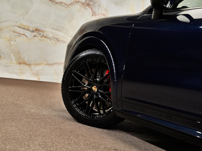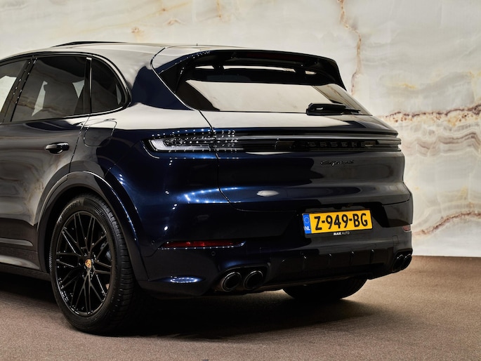 Deze Cayenne S E-Hybrid is uitgevoerd in het stijlvolle Algarve Blauw Metallic (D6) en krijgt een sportieve uitstraling door het Exterieurpakket Zwart Hoogglans (QJ4) en het SportDesign pakket in hoogglans zwart (2D5). De 21-inch RS Spyder Design-wielen (57S) versterken de dynamiek van het model. De getinte HD-Matrix LED-koplampen (8JU) en de getinte LED-achterlichten (8SB) zorgen voor een moderne high-end uitstraling, terwijl het ‘PORSCHE’ logo in hoogglans zwart (0NC) het geheel elegant afwerkt.