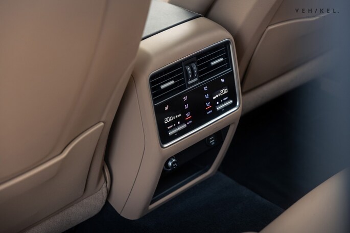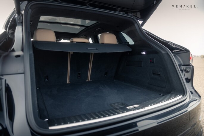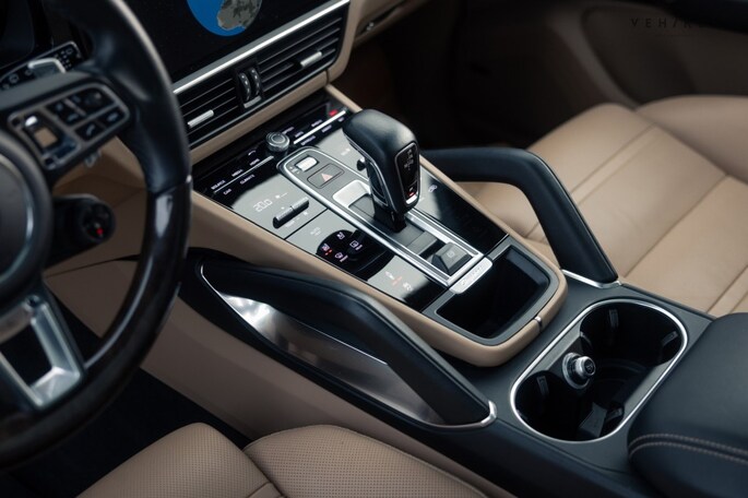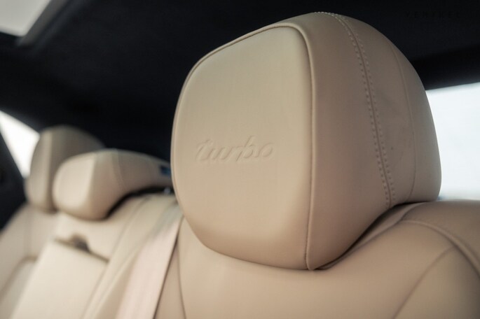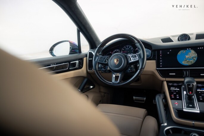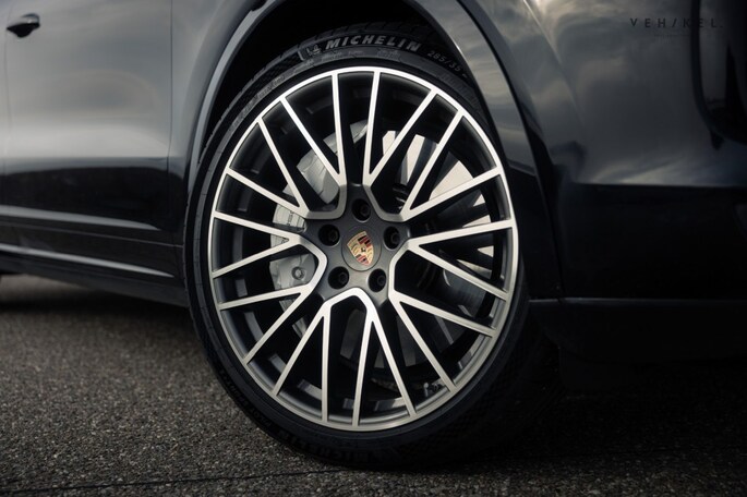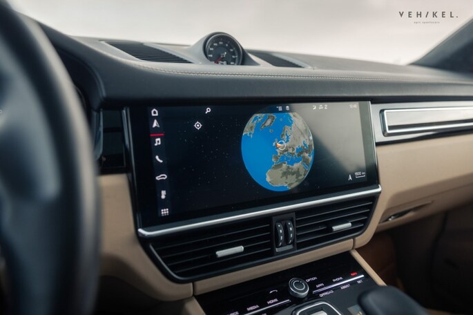 De Matrix LED-kijkers aan het front en de rode LED-lichtbalk die beide units aan elkaar verbindt zijn karakteristiek voor de huidige generatie Porsche Cayenne; nog zon 911-trekje. Aan de binnenkant is het luxe uitrustingsniveau van de Cayenne Turbo extra goed zichtbaar. Elektrisch bedienbare, verwarmde stoelen met memoryfunctie maken het wel erg aantrekkelijk om ongegeneerd naar het lederen dashboard te blijven loeren. De zwarte afwerking is deels identiek aan die van de stoelen, middenarmsteun en portierbekleding. Het interieur is afgewerkt in de leder bi-color combinatie zwart-mojavebeige. De hemelbekleding is van een ander materiaalsoort, echter niet minder zwart. Liever meer licht? Het panoramadak voedt de ruimtelijk sferen aan boord van de SUV. Soft-close portieren, Adaptive Cruise Control, luchtvering, parkeerassistent, Bose audio, Apple CarPlay, een elektrische achterklep en automatisch dimmende spiegels binnen + buiten onderstrepen het feit dat dit toch echt een Porsche is waarmee je in alle comfort de dagelijkse bezigheden kunt uitvoeren. Is het tijd voor het ultieme sportwagengevoel? Handen bij de schakelflippers en laat de sound de rest doen…