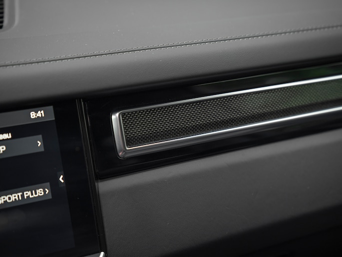 Met recht een performance-SUV dus, deze Porsche Cayenne Turbo. Vandaar dat de keuze om het zwart lederen interieur van een carbon interieurpakket te voorzien, een hele logische is. Behalve racy, doet het binnenwerk ook erg luxueus aan: let bijvoorbeeld op de alcantara hemelbekleding inclusief stijlen. Hoewel nagenoeg alle details donker van kleur zijn, tot en met de stiksels, de Porsche emblemen in de hoofdsteunen en de achtergrond van het Sport Chrono klokje midden op het dashboard aan toe, hoeft het allerminst duister aan boord te worden – laat staan ongezellig. Dit is mede te danken aan het grote glazen panoramadak en sfeervolle Ambient Lighting. Laat het ondertussen vooral ook even tot u doordringen dat deze sportauto 5 zitplaatsen telt… En heel veel binnenruimte heeft!