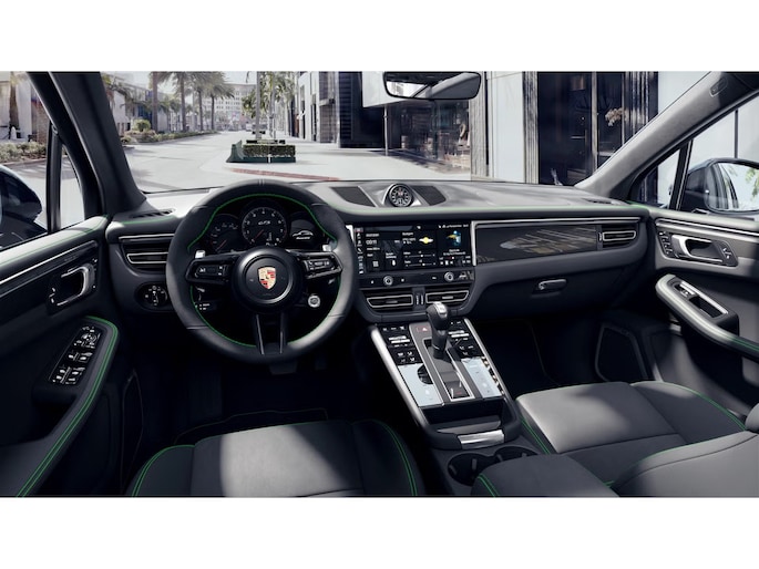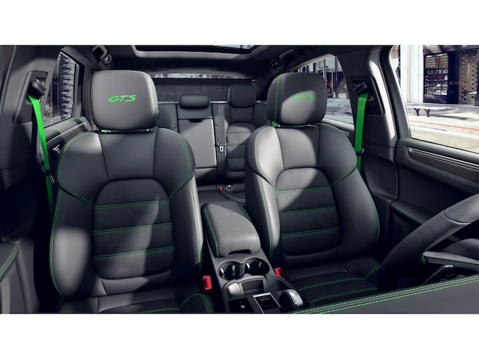 Macan GTS met GTS interieurpakket Python, unieke samenstelling met veel extra delen in leer waarbij alles is doorgestikt in afwijkende kleur pythongroen. Het GTS interieur pakket is alleen te bestellen in combinatie met het GTS exterieurpakket. Als pakket bevat het naast het bovenstaande o.a: