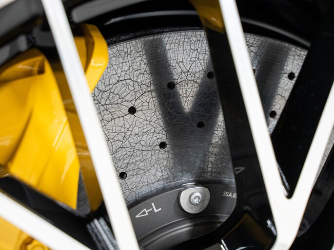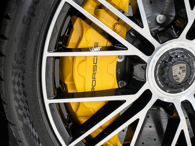 Porsche Ceramic Composite Brake (PCCB) met geel gespoten remklauwen
