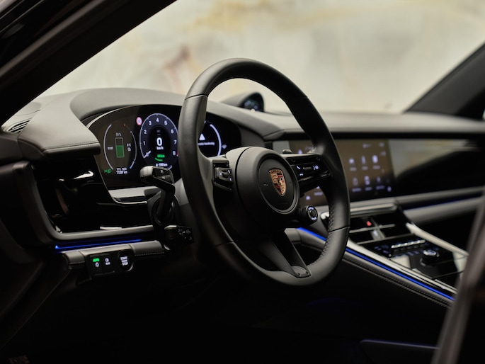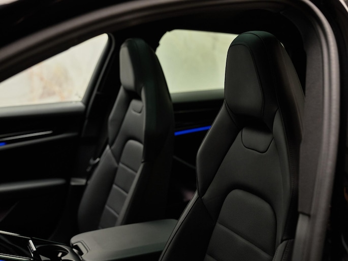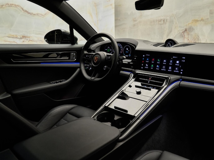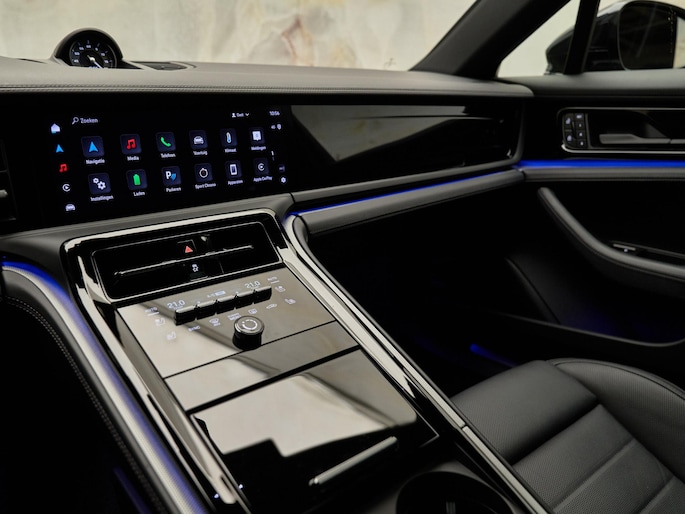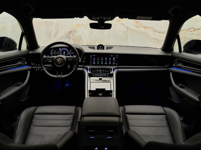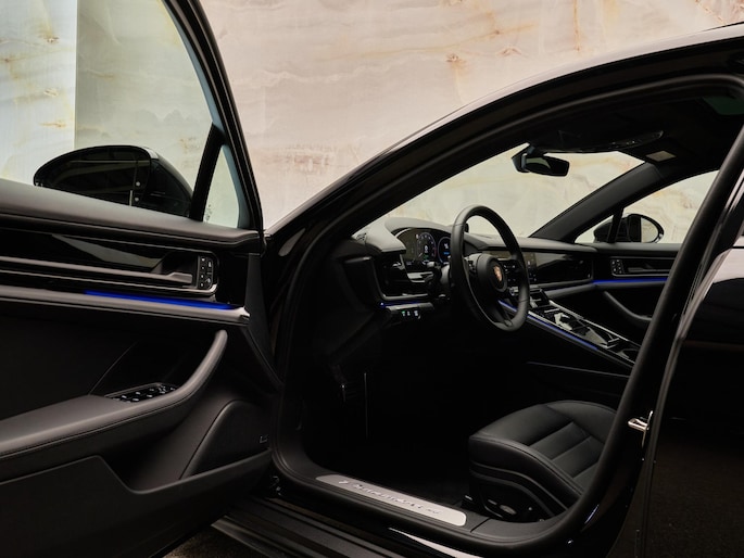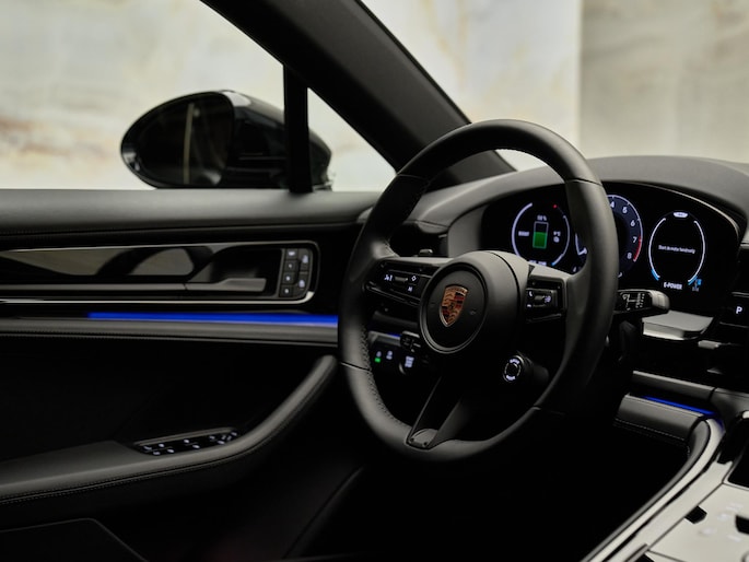 Het interieur van deze Panamera 4 E-Hybrid is gericht op maximaal comfort en hoogwaardige afwerking. De Comfortstoelen (Q2J) zijn 14-voudig elektrisch verstelbaar en voorzien van een memorypakket, waardoor altijd de ideale zitpositie kan worden ingesteld. Voor extra luxe zijn de voorstoelen uitgerust met stoelventilatie (4D3) en is het sportieve karakter benadrukt met een verwarmd GT-sportstuurwiel (2PJ). Het panoramadak (3FU) zorgt voor een lichte en ruimtelijke ambiance in het interieur.