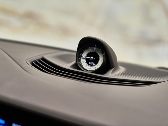 Het interieur is afgewerkt met Club lederen interieur Olea, basalt zwart, aangevuld met Dashboardbekleding leder (5HB) en Interieurpakket mat carbon (5MH). Stoelverwarming (4A3) verhoogt het comfort, terwijl Gordels krijt (FI8) en Wijzerplaat Sport Chrono wit (UP3) zorgen voor een sportieve touch. Met Porsche Entry & Drive (4F2) en HomeLink (VC2) beschikt u over extra gemak in het dagelijks gebruik. De Stuurcode individuele kleur (0UB) benadrukt het exclusieve karakter van deze uitvoering.