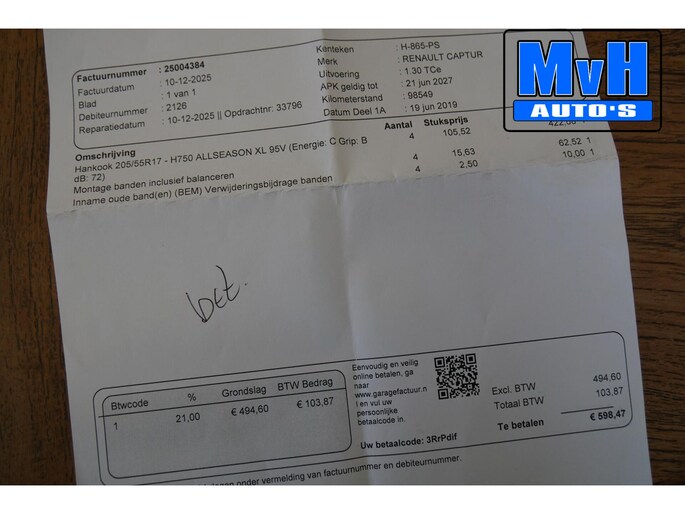 Ook zijn er in december 2025 bij 98.549km (1.000km geleden) 4 nieuwe Hankook All-Season banden gemonteerd T.W.V €600,-