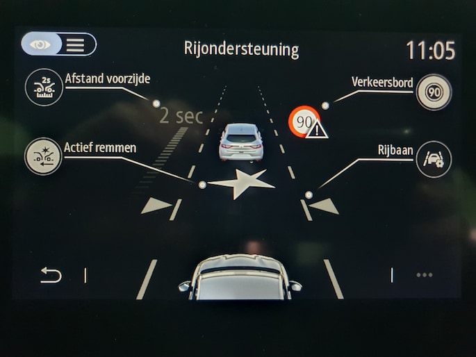 Pragmatisch en veilig als deze auto is, beschikt hij over diverse veiligheidssystemen. Dat de auto steeds meer taken van de bestuurder overneemt, merkt u bijvoorbeeld aan het systeem voor verkeersbord-detectie in deze auto. Indien u onbedoeld de rijstrook lijkt te verlaten, reageert het Lane-keeping systeem meteen en corrigeert. In deze Renault vinden we verder een hill hold functie, autonoom remsysteem en bandenspanningcontrolesysteem.