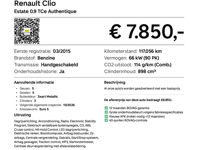 Deze Renault Clio Estate 0.9 TCe Authentique is een nette en praktische stationwagon met een zuinige 0.9 TCe-benzinemotor, ideaal voor dagelijks gebruik en dagelijks woon-werkverkeer. De auto is voorzien van handige functies zoals cruise control, navigatie, airconditioning en een royale bagageruimte perfect voor boodschappen, hobby’s of weekendjes weg. Een betrouwbare en veelzijdige keuze voor wie een compacte én functionele auto zoekt.