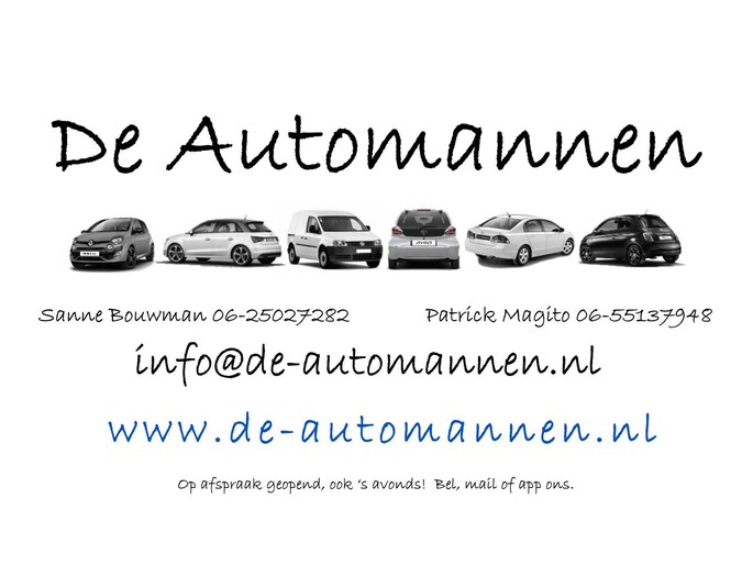 Voor een afspraak voor bezichtiging, een proefrit, taxatie van uw inruilauto of gewoon meer informatie; bel, mail of Whatsapp met Sanne op 06-25027282 of Patrick op 06-55137948. We zijn van 09.00 uur tot 19.00 uur op beide nummers te bereiken. Een email sturen kan ook: info@de-automannen.nl