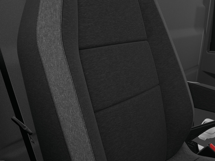 • Stoffen stoelbekleding in gemêleerd donkergrijs met donkergrijze stiksels, lichtgrijze baan op de buitenzijde van de stoelen en versterkte kunstlederen wangen voor de bestuurdersstoel