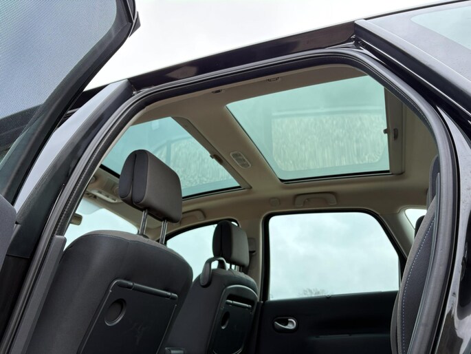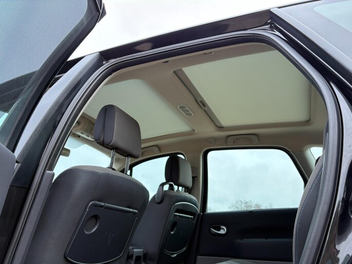 Zo is de Renault uitgerust met een dubbel panorama dak, schuifdak elektrisch, zonwering achter, trekhaak, climate control, cruise control, elektrische ramen en spiegels, armsteun voor, elektrische handrem, parkeer sensoren, 16 inch velgen, radio, verstelbare stoelen, bluetooth bellen, lederen stuurwiel, enz enz.