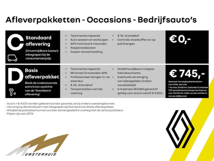 - Afleverpakket Occasions C (zonder meerprijs): Standaard aflevering t.w.v. €0,- - Technische inspectie - Vloeistof controle - APK minimaal 6 maand - Wassen & stofzuigen van de bus - €10,- aan brandstof - Onvermijdbare kosten zoals legeskosten & tenaamstellingskosten