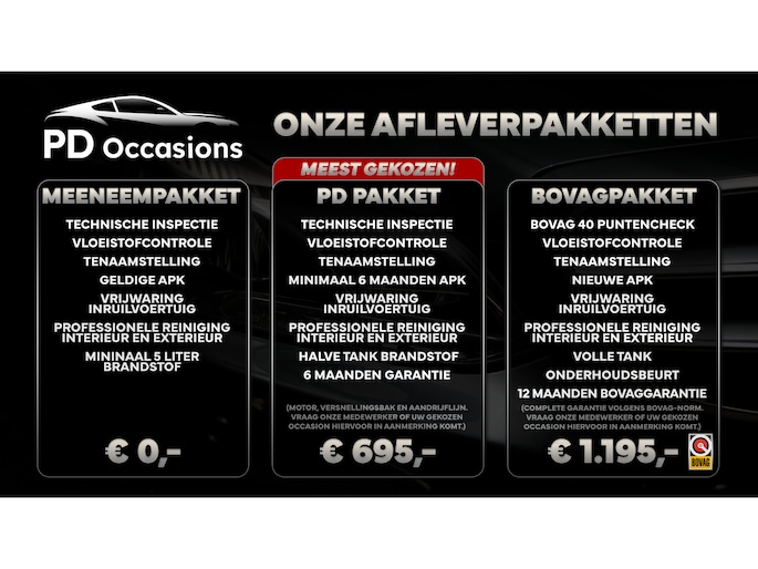 • PD Pakket (Meest gekozen!) (€ 695 meerprijs): Dit afleverpakket bevat (in plaats van afleverpakket "Meeneem Pakket"): Huisgarantie (6 maanden garantie); 6 maanden huis garantie, Halve tank brandstof, Minimaal 6 maanden APK, Professioneel poetsen, Technische inspectie, Tenaamstelling, Vloeistofcontrole, Vrijwaring Inruilvoertuig