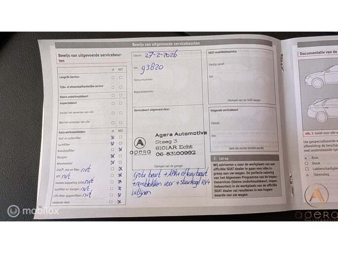 Geen zorgen, we hebben de Arona van top tot teen nagekeken. De auto is helemaal afleverklaar gemaakt. Naast een uitgebreide check hebben we de auto voorzien van een nieuwe APK keuring (uitgevoerd door een onafhankelijke garage). Hier kwam de auto zonder adviespunten doorheen. We hebben de auto een grote beurt gegeven; alle filters, alle vloeistoffen én de bougies, allemaal helemaal fris. De remblokken waren wat dun aan het worden, dus die hebben we direct vervangen. Verder zat er een klein beetje speling op een stuurkogel, dus het spoorstangeind is direct vervangen. Verder is het hele verleden van de auto netjes gedocumenteerd. We reisden voor deze Seat af naar de Seat dealer in Drachten. Zij hebben de auto nieuw geleverd en altijd met de grootste zorg onderhouden.