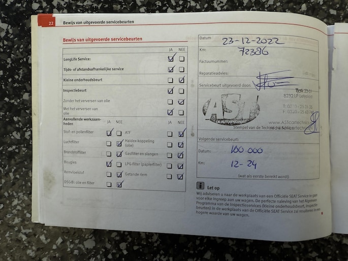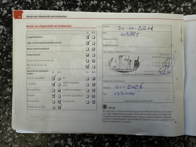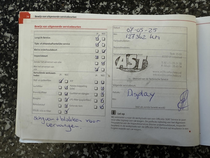 ✓ De laatste onderhoudsbeurt is uitgevoerd op 07-05-2025 met 127.362 km.