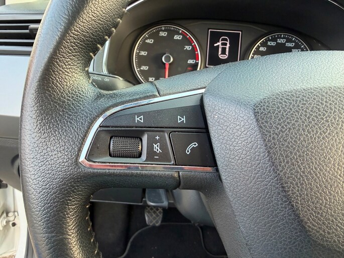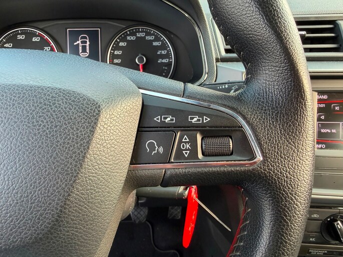 Adaptive cruise control houdt de ingestelde snelheid vast en houdt afstand tot het voertuig voor u. Een optie die de veiligheid verhoogt, is de bediening vanaf het stuur van het audiosysteem (met dab-radio!). Het luxeniveau in deze SEAT is niet alleen gericht op comfort, maar ook op uw veiligheid. Tal van sensoren helpen u om de omgeving in de gaten te houden. De automatisch inschakelbare verlichting zorgt dat automatisch de verlichting wordt ingeschakeld als het donker wordt, wat bijvoorbeeld in tunnels erg handig is. En de regensensor zet de ruitenwissers aan zonder dat u eraan hoeft te denken. Met één druk op de knop blaast de airconditioning een koele bries door het interieur. Wat u ook in deze auto kunt vinden zijn automatisch dimmende binnenspiegel, isofix-aansluiting, centrale deurvergrendeling met afstandsbediening, bagage afdekhoes, boordcomputer en lederen versnellingspook.