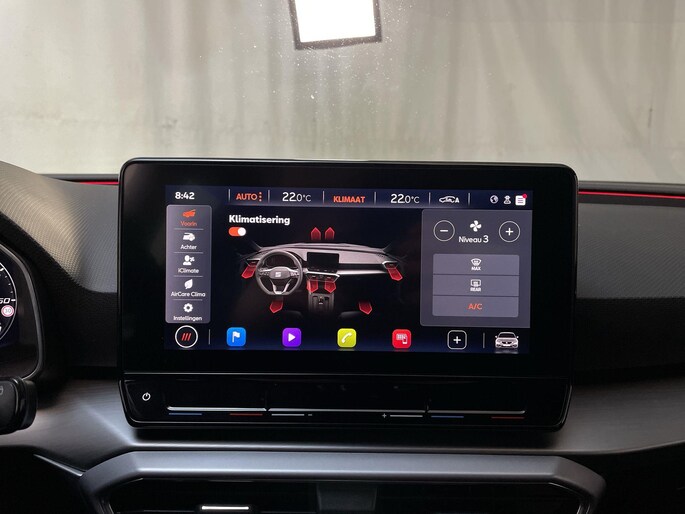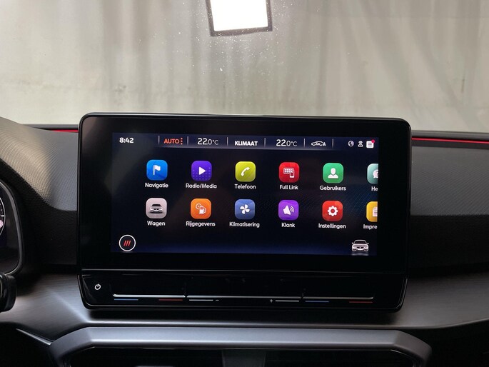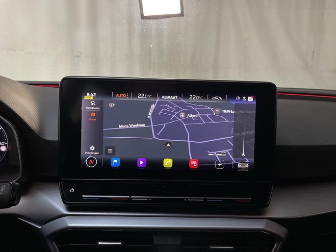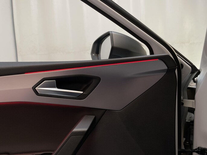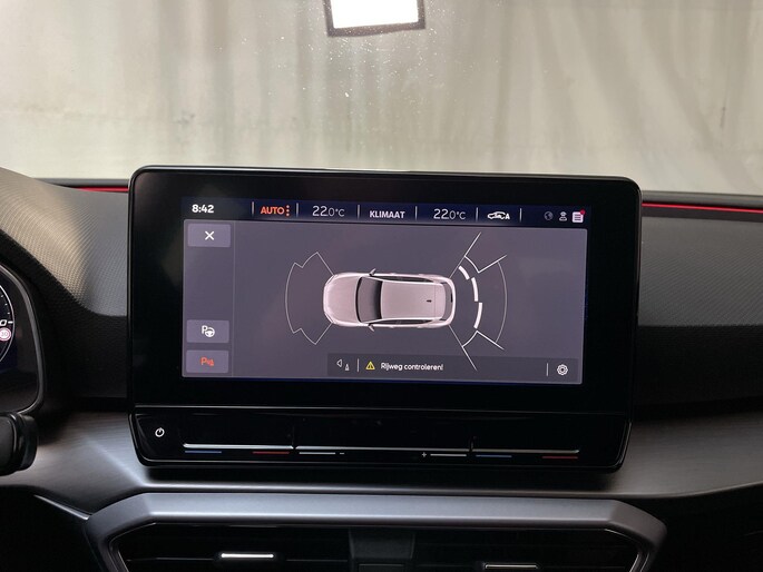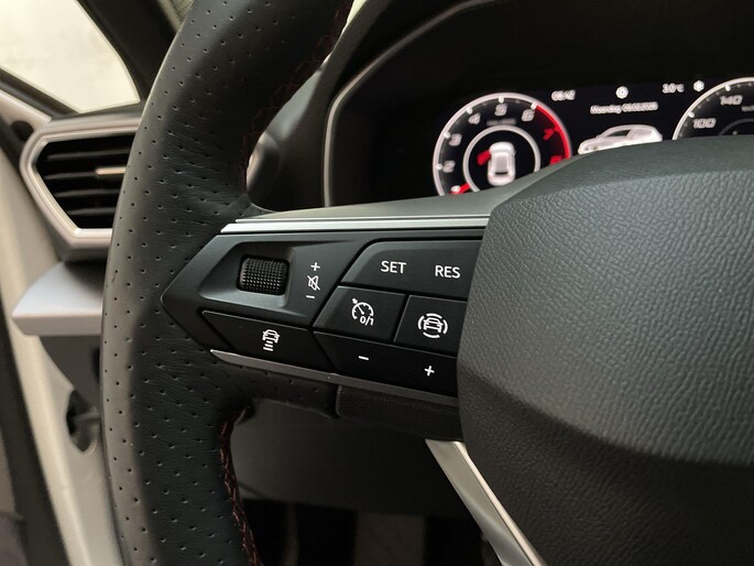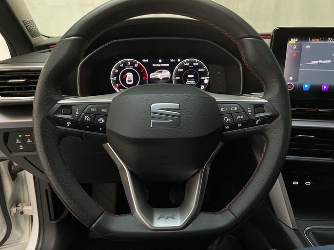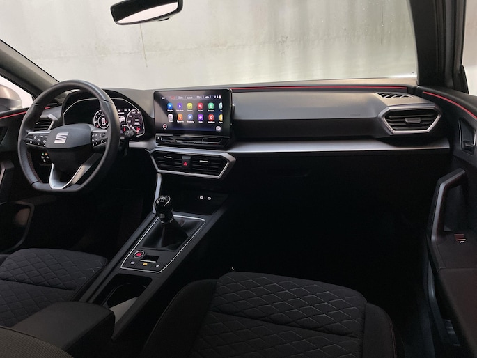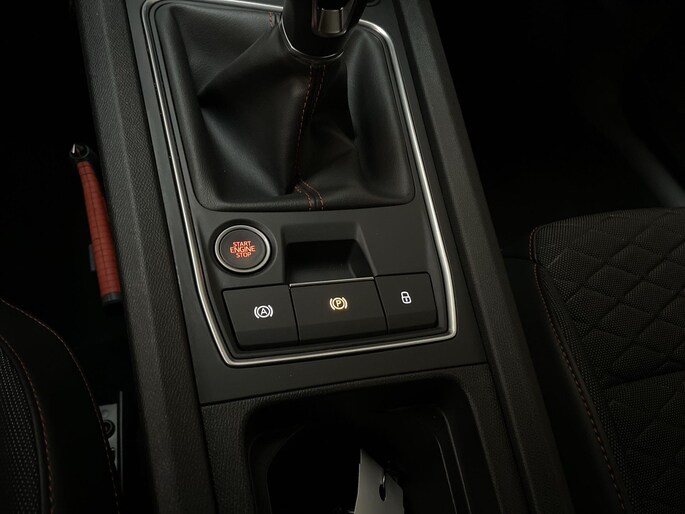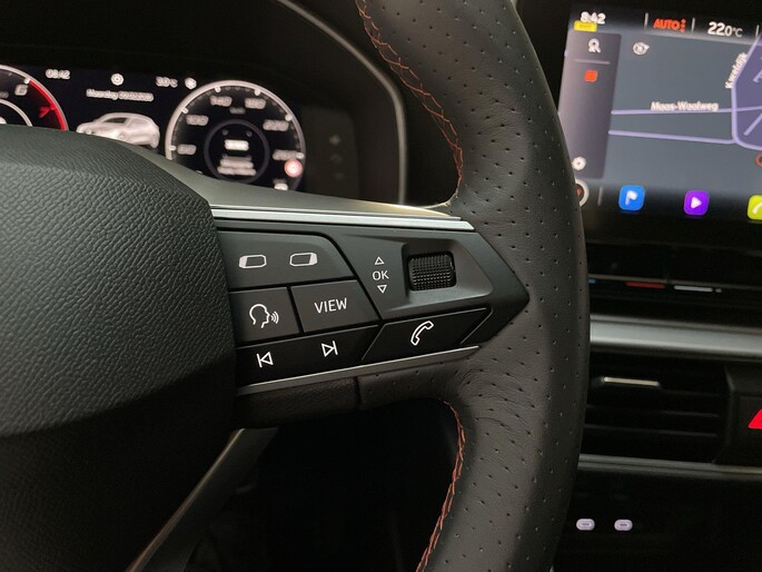 Het digitale dashboard is qua lay-out en zichtbaarheid superslim ingedeeld. Alle functies in één keer in beeld! Adaptive cruise control houdt de ingestelde snelheid vast en houdt automatisch afstand tot jouw voorligger. Appen met je auto? Geen probleem. Je kunt van overal contact opnemen, de functies controleren en activeren. Je bedient 'm met remote services. In deze Leon vind jij niet alleen schakelaars op het stuur om het navigatiesysteem te bedienen en het audiosysteem met DAB-ontvangst, maar er is ook spraakbediening. Tot de standaard uitrusting van deze auto hoort ook automatische airconditioning. Je bent in deze Seat ook voorzien van parkeersensoren achter, regensensor, sportstuurwiel, automatisch dimmende binnenspiegel, centrale deurvergrendeling met afstandsbediening en lederen versnellingspook.