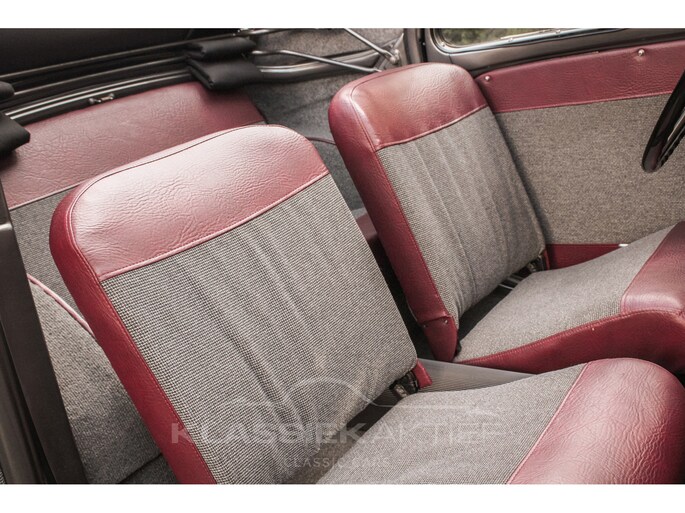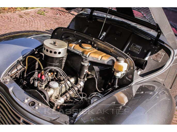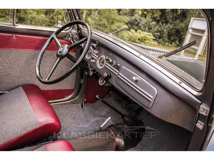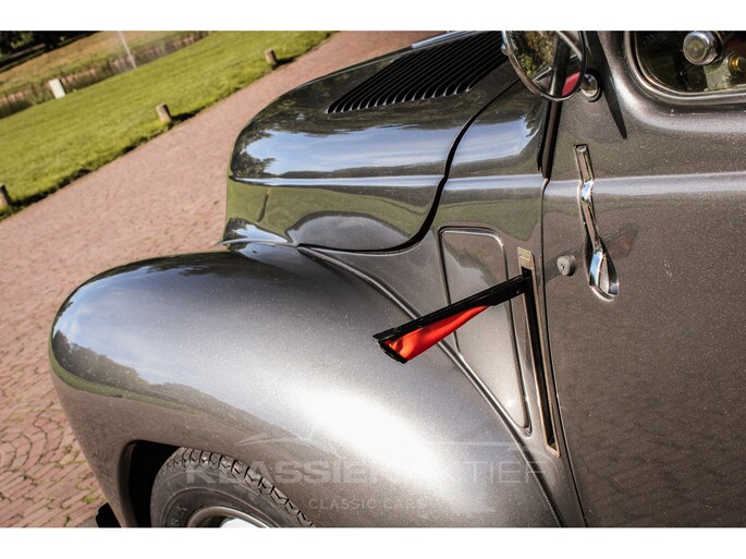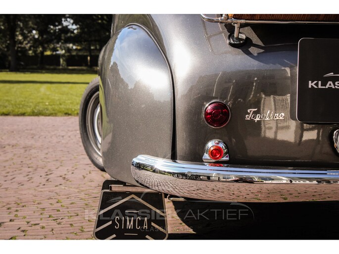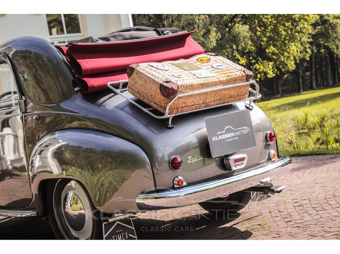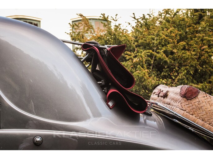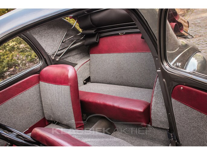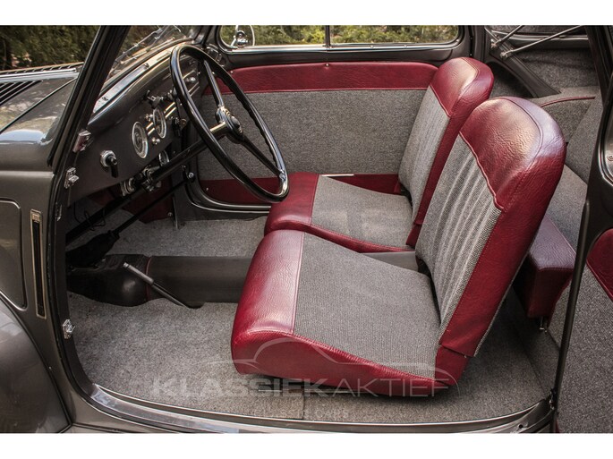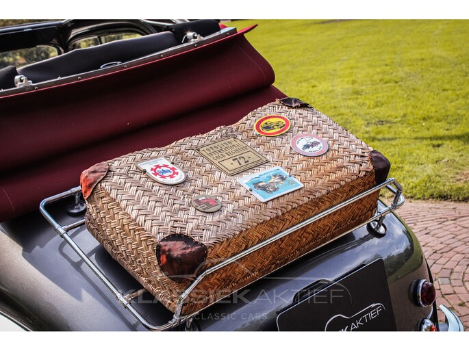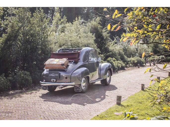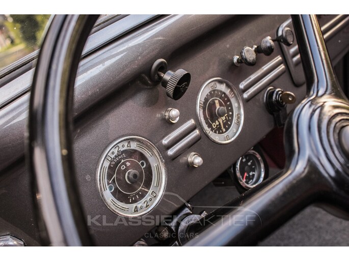 This car was originally delivered in France in 1949 and arrived in the Netherlands in 2009. After a thorough and extensive body-off restoration (photos available), the car was registered in the Netherlands in 2014. During this restoration, the car was painted in the beautiful Fiat Grigio Quarzo. This body colour is not only stunning to look at but also combines perfectly with the red/grey interior. The retractable canvas roof is in perfect condition and also in a matching red color. After the restoration, the car has been maintained with great love and care and remains in excellent condition. The body panels fit together well, and the doors close securely and well. The chrome and trim are in very good and shiny condition, and the rubber parts and trim are also in excellent condition. The white rims with chrome hubcaps are in excellent condition and make a stunning combination with this car. This also applies to the chrome luggage rack with a matching wicker basket.