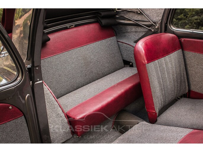 The interior is in perfect and almost new condition. The red/gray upholstery is in excellent condition and is truly stunning. The upholstery is a combination of cloth (gray) and imitation leather (red), giving the car a stylish character. The seats are not only in perfect condition but also surprisingly comfortable. The dashboard is also in exceptionally good condition. The various chrome and trim parts are in very good condition. A small storage compartment is accessible from the rear seat. Under the hood, we see a very neat and tidy engine compartment. It's clear that this car has received a great deal of love and care. We've rarely seen such a neat engine compartment. The 570cc four-cylinder engine runs exceptionally well and smoothly. Thanks to its low weight, the 16 hp is sufficient for a smooth and comfortable drive. The brakes feel good and firm, and the steering is exceptionally smooth. Shifting is also very easy and precise. All of this makes this compact classic Simca a wonderful driver's car.