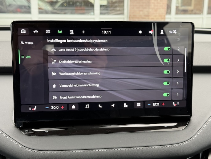 Elektronische veiligheidsvoorzieningen helpen u onderweg om de situatie op de weg te beoordelen. Deze systemen waarschuwen u als er een riskante situatie ontstaat, en kunnen in bepaalde gevallen ook zelf ingrijpen. Het Lane-keeping systeem doet precies wat nodig is: waarschuwen en corrigeren bij onbedoelde overschrijding van de rijstrooklijnen. In een noodsituatie waarschuwt forward collision warning bij een dreigende aanrijding met een voorligger. Vermoeidheidsherkenning is een systeem dat met verschillende sensoren tekenen van vermoeidheid bij de chauffeur waarneemt. Deze krijgt tijdig een waarschuwing, wat ongelukken kan voorkomen. Met voorzieningen als dodehoekdetectie, autonoom remsysteem en bandenspanningcontrolesysteem, bent u altijd veilig onderweg.