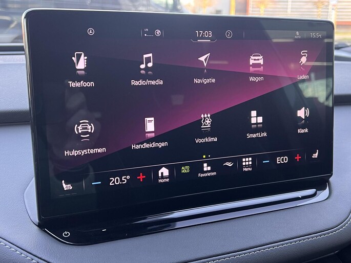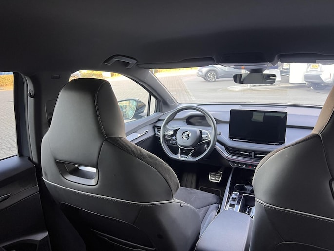 Zoals u mag verwachten van deze Skoda Enyaq iV is hij uitgerust met een reeks aan actieve veiligheidssystemen. In het instrumentarium laat de verkeersborddetectie de actuele verkeersborden zien. Het Lane-keeping systeem garandeert dat u zich niet onverhoeds buiten de lijnen van de rijstrook begeeft. Het systeem van forward collision warning, of in gewoon Nederlands 'botswaarschuwing', treedt in werking als de sensor te weinig afstand signaleert met een voor- of tegenligger. In deze Skoda vinden we verder een dodehoekdetectie, vermoeidheidsherkenning, frontale botsbescherming en bandenspanningcontrolesysteem.