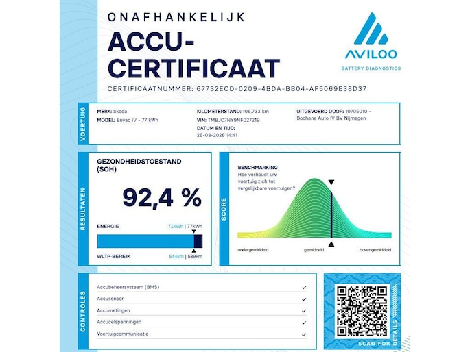 Skoda heeft de auto opnieuw uitgevonden. De volledig elektrische Skoda Enyaq iV is duurzaam, maar biedt tegelijk veel rijcomfort en geweldige prestaties. Dit exemplaar is van het bouwjaar 2021, er staat 106732 kilometer op de teller. Fiscaal aantrekkelijk is de elektromotor, waarmee u niet alleen stil maar ook uitermate pittig kunt rijden. De stoelen zijn verwarmd en bieden ook in winterse kou een comfortabele zit. Het glazen panoramadak zorgt voor een onovertroffen uitzicht. Nooit meer koude handen of koude vingers in de auto. Stuurverwarming zorgt ervoor dat het stuur behaaglijk warm aanvoelt. Verder is de Skoda uitgerust met: 19 inch lichtmetalen velgen, LED koplampen, extra getint glas, in delen neerklapbare achterbank, LED-achterlichten en verstelbare lendensteunen.