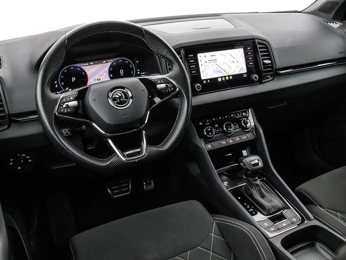 Hij is nét niet meer nieuw, dus komt-ie nu pas goed op toeren. Met alle pluspunten van een nagelnieuwe bolide. De aandrijving komt voor rekening van een benzinemotor en een automatische transmissie. De verwarmbare voorstoelen zijn een weldaad voor rug en schouders. De sportstoelen geven het interieur een super strakke look. Beknibbelen op comfort is er niet bij met deze Skoda Karoq. Hij is zelfs voorzien van een verwarmd stuurwiel! Opvallend is de geavanceerde matrix LED-verlichting met daglichtkwaliteit. De koplampen dimmen automatisch het deel van de lichtstraal waar voor- of tegenliggers in rijden. De overige segmenten blijven aan en verlichten de weg maximaal. Bij de uitrusting van deze auto horen onder meer 17 inch lichtmetalen velgen, extra getint glas, in delen neerklapbare achterbank, LED-achterlichten, verstelbare lendensteunen en verwarmde ruitensproeiers.