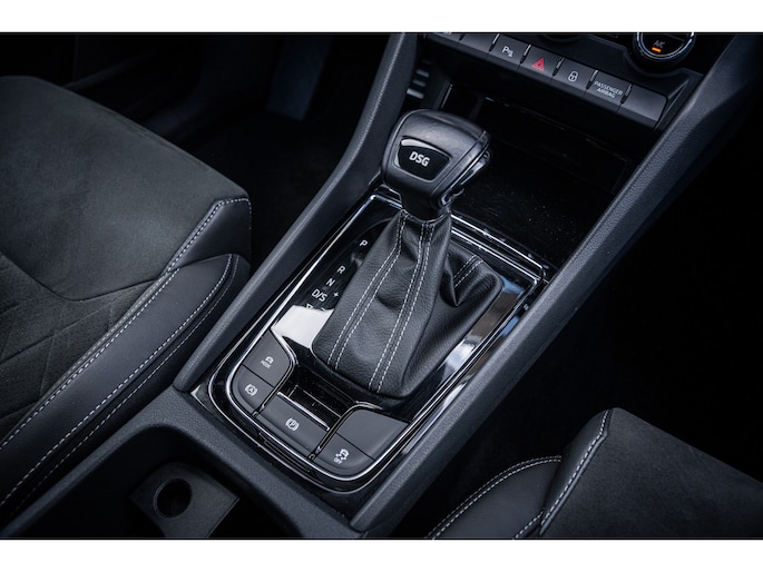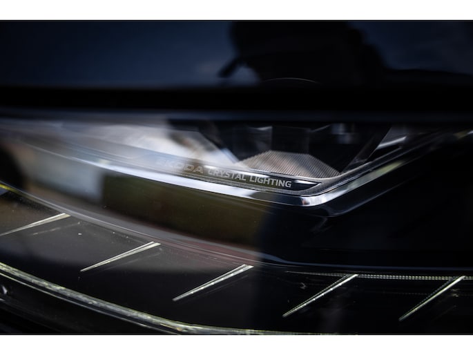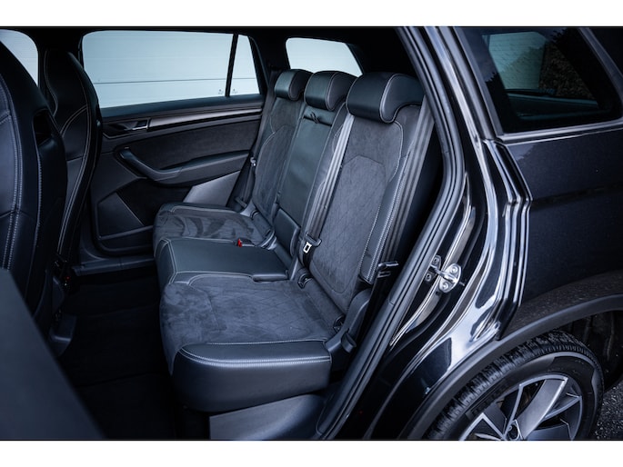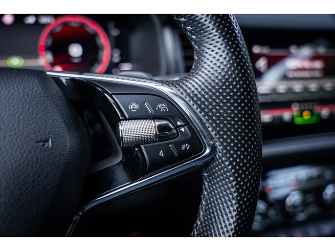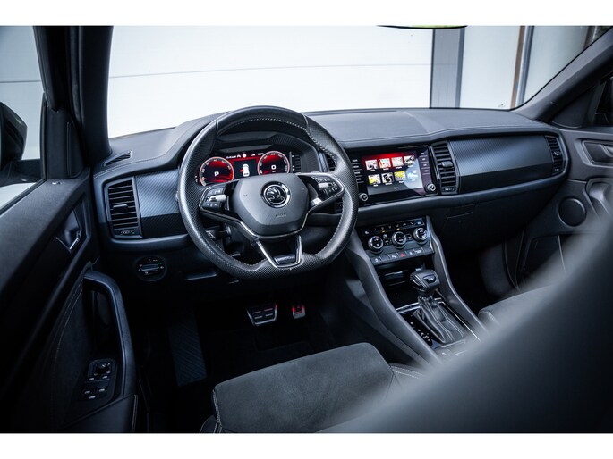 Sportieve uitstraling met 19” lichtmetalen velgen, carbon accenten, dakrails en extra getint glas. De metallic lak en Sportline details geven deze Kodiaq een krachtige en luxe look.