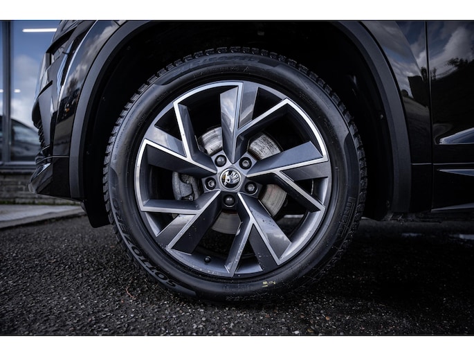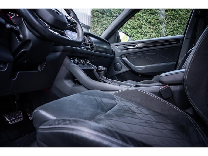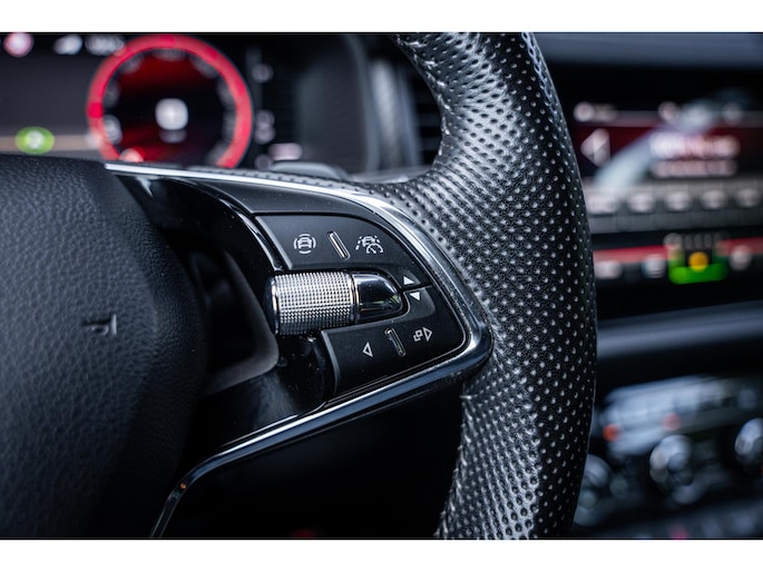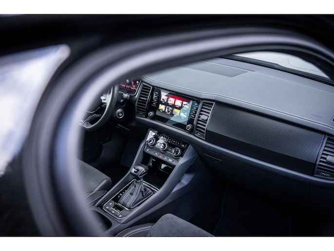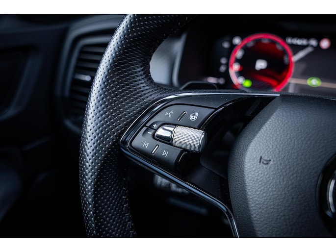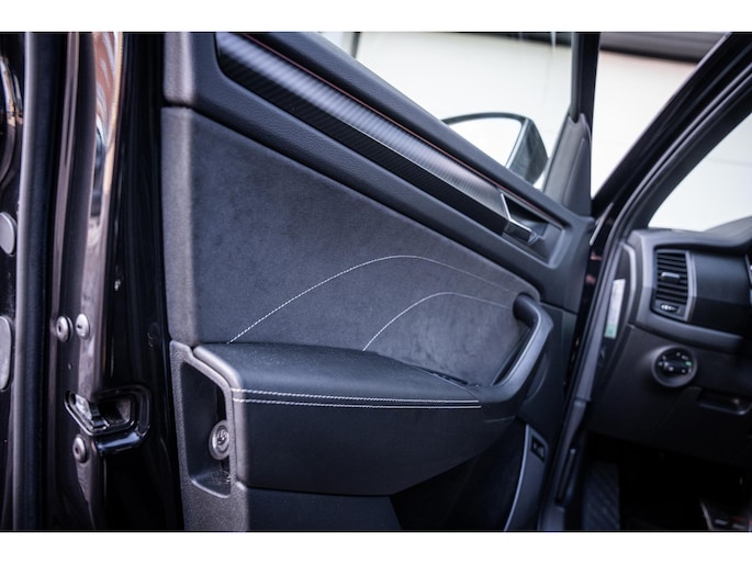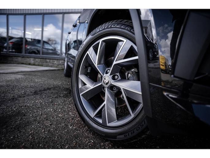 Sportieve uitstraling met 19” lichtmetalen velgen, carbon accenten, dakrails en extra getint glas. De metallic lak en Sportline details geven deze Kodiaq een krachtige en luxe look.